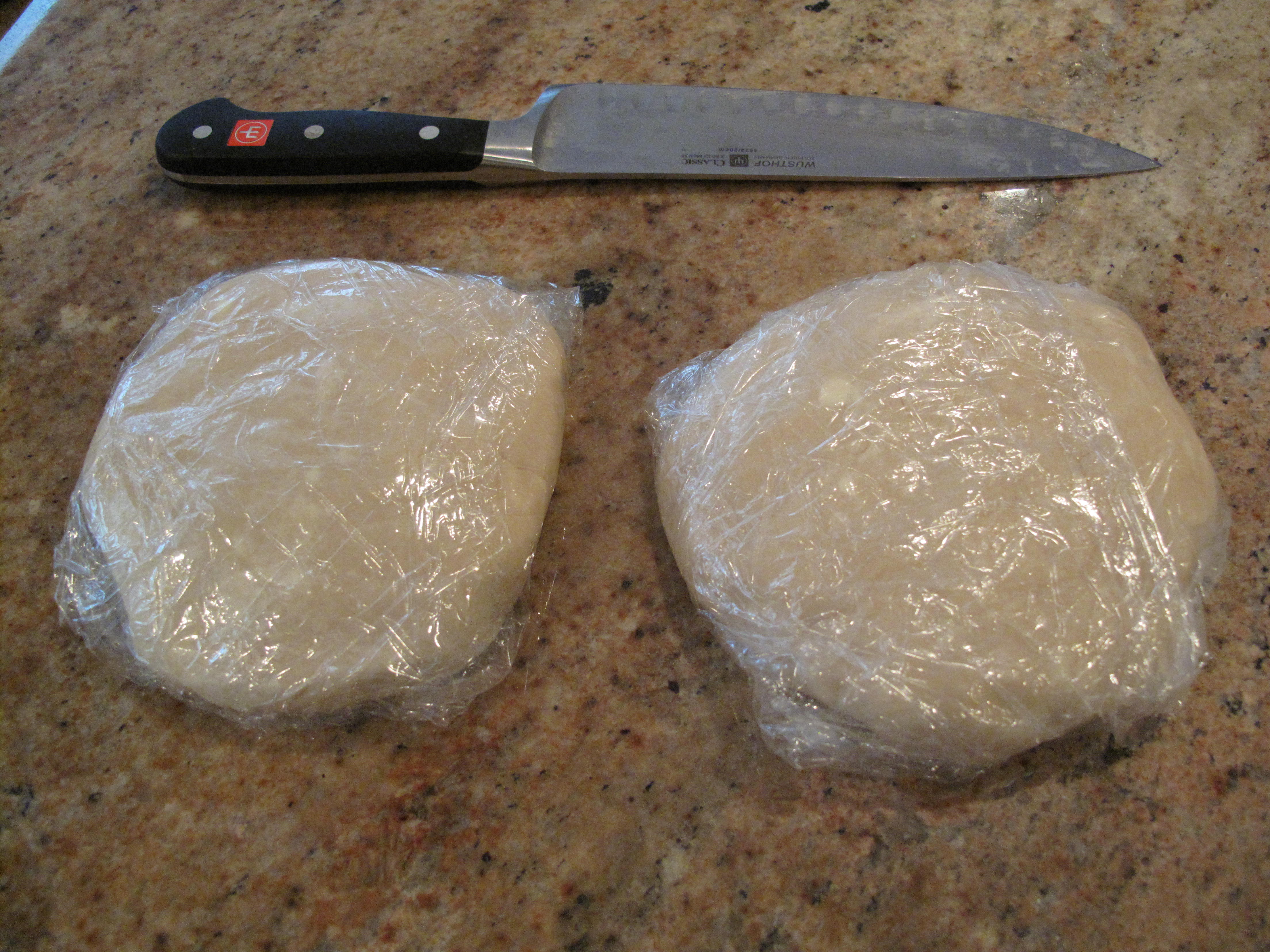 Assemble pie: Roll out 1 dough disk on floured work surface into a 13-inch round. Transfer to a 9-inch-diameter glass pie dish. Trim excess dough, leaving a 3/4-inch overhang. Place into refrigerator so the crust can continue to chill after being worked with in this step. Chilled pie dough bakes the best.