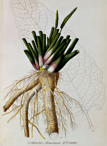 By the 16th century, the pungent root was spreading throughout England, where it was described for its many uses, including as an aphrodisiac, a treatment for tuberculosis, a mustard plaster and a dewormer. The common name probably evolved from the German “meerrettich,” which means sea-radish, which was misunderstood by the English, who associated “meer” with “mahre,” an old horse.