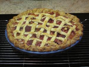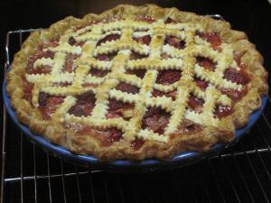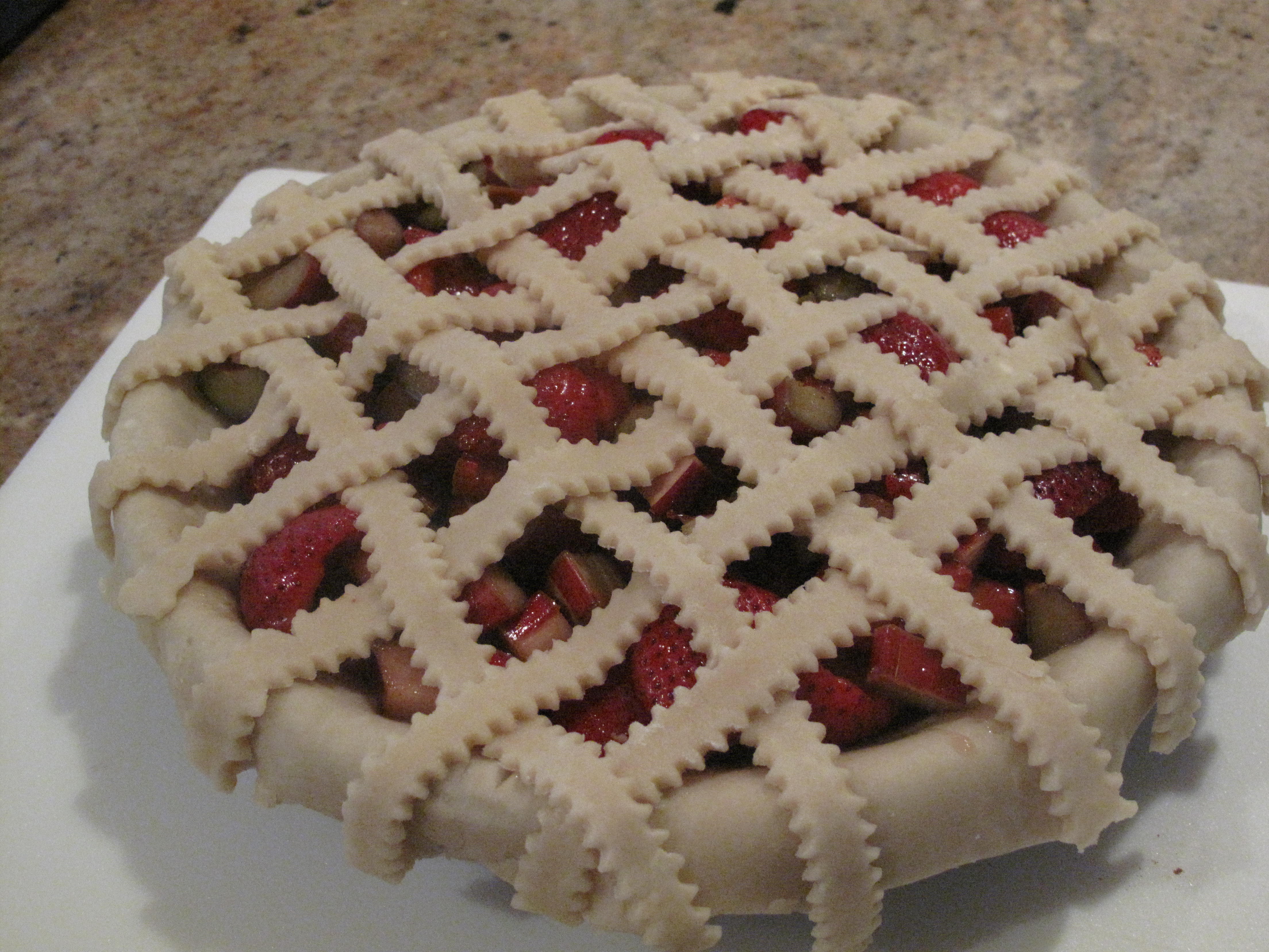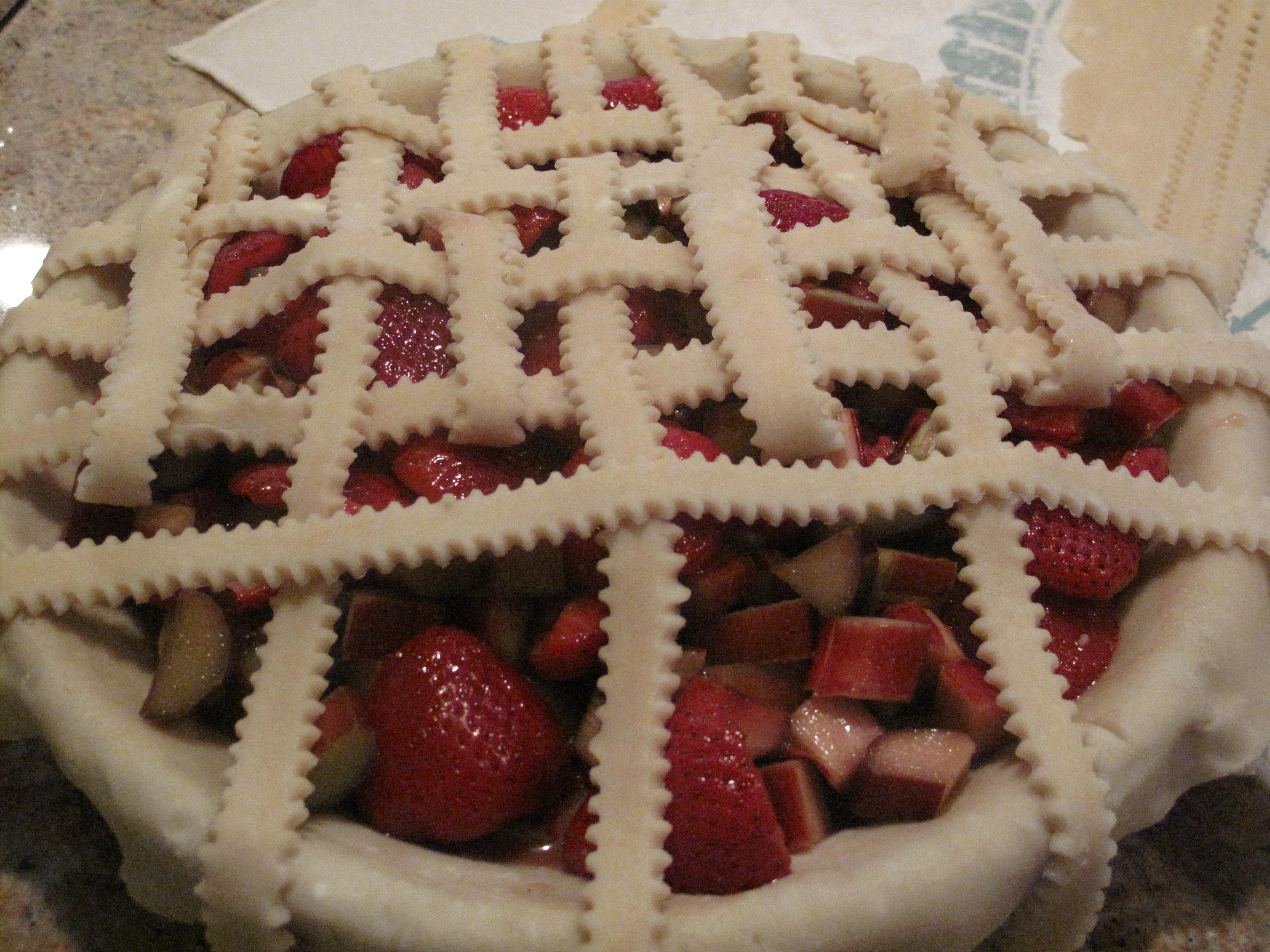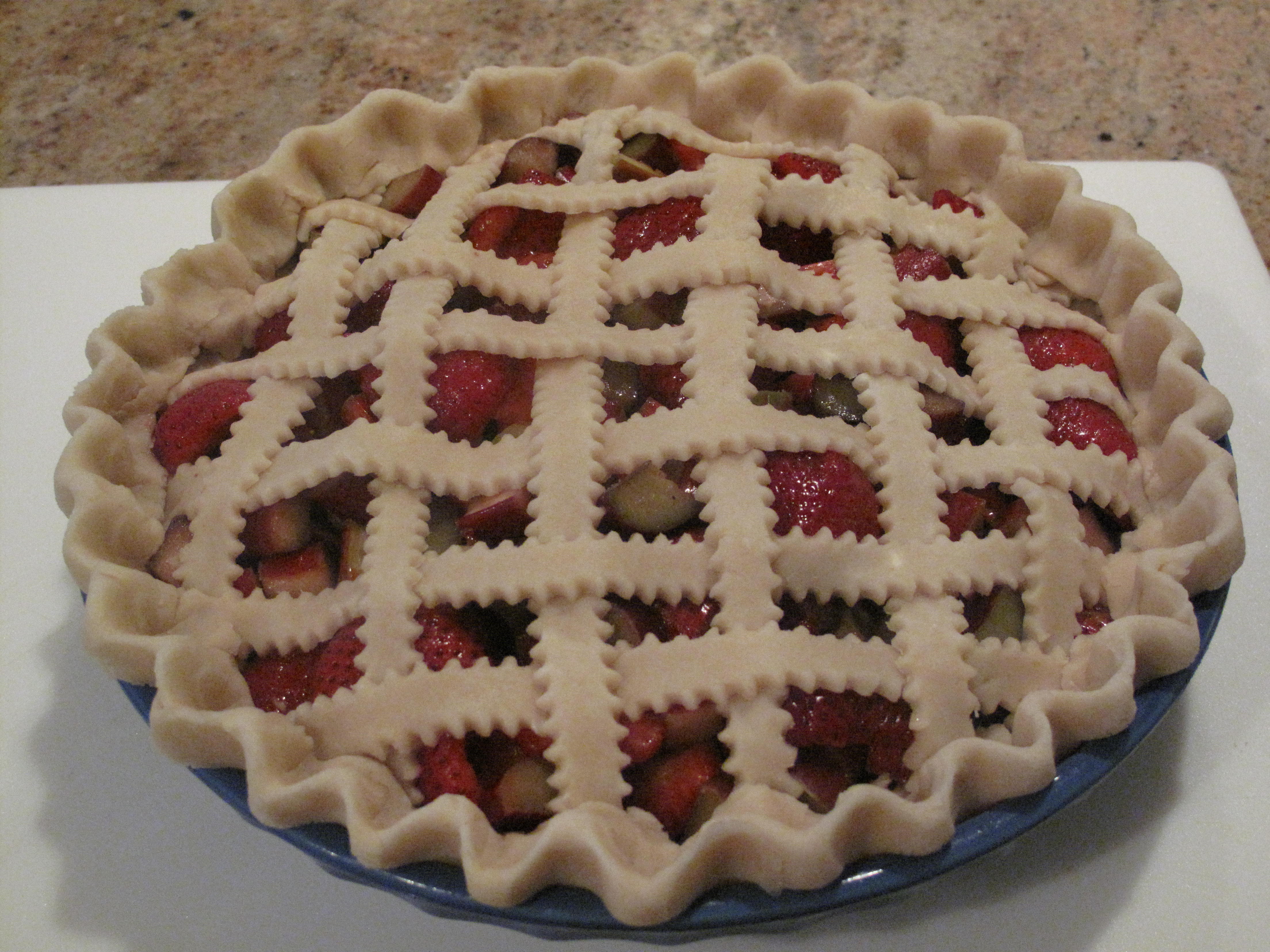 This pie always reminds me of Spring. It is a rhubarb and strawberry pie with a lattice top crust. Making a pie is always intimidating to me. It’s the crust. Either I have a problem rolling it out or I have a problem getting it into the pie pan. A lot of people tell me they have the same issues, but I keep trying to perfect the art of pie making here on Glen Road. This pie was a surprise in that for the first time in a long time I didn’t have any issues. I even put a lattice top on it without making myself nuts. It must have been the deep breaths and the frequent praying. The idea of rhubarb and strawberries mixed together in this pie was so perfect for Spring. I couldn’t wait to get a piece. We’ve talked about rhubarb and strawberries a lot here on Acorns On Glen. Spring just seemed the perfect time to mix them together for everyone to enjoy. Let’s get baking!