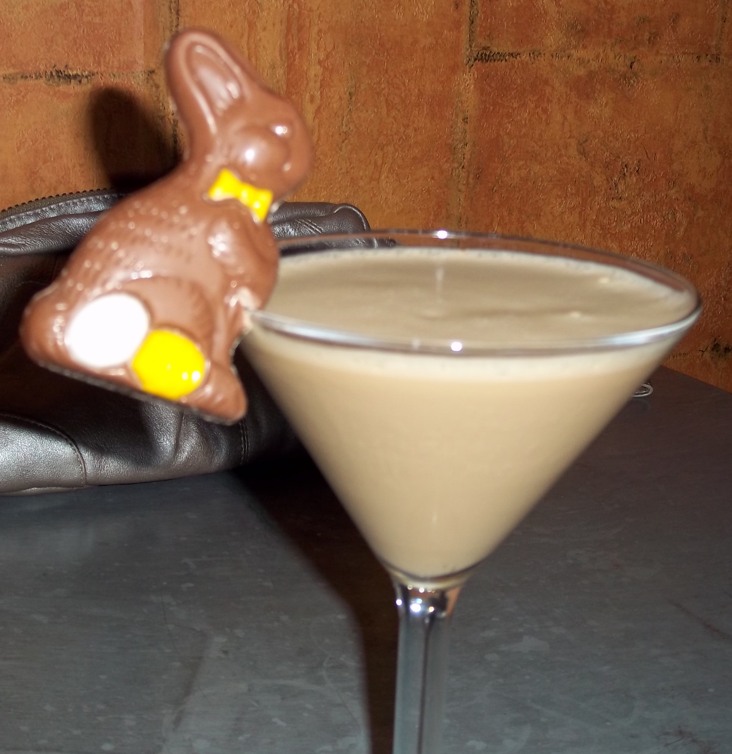 Place ingredients into a martini shaker with ice. Shake well with ice and strain into a chilled martini glass. Using a small knife, make a slice upwards under the ribs of the chocolate bunny. (Attention animal lovers: this will not hurt the bunny). Hook on the rim of the martini glass and drink.
