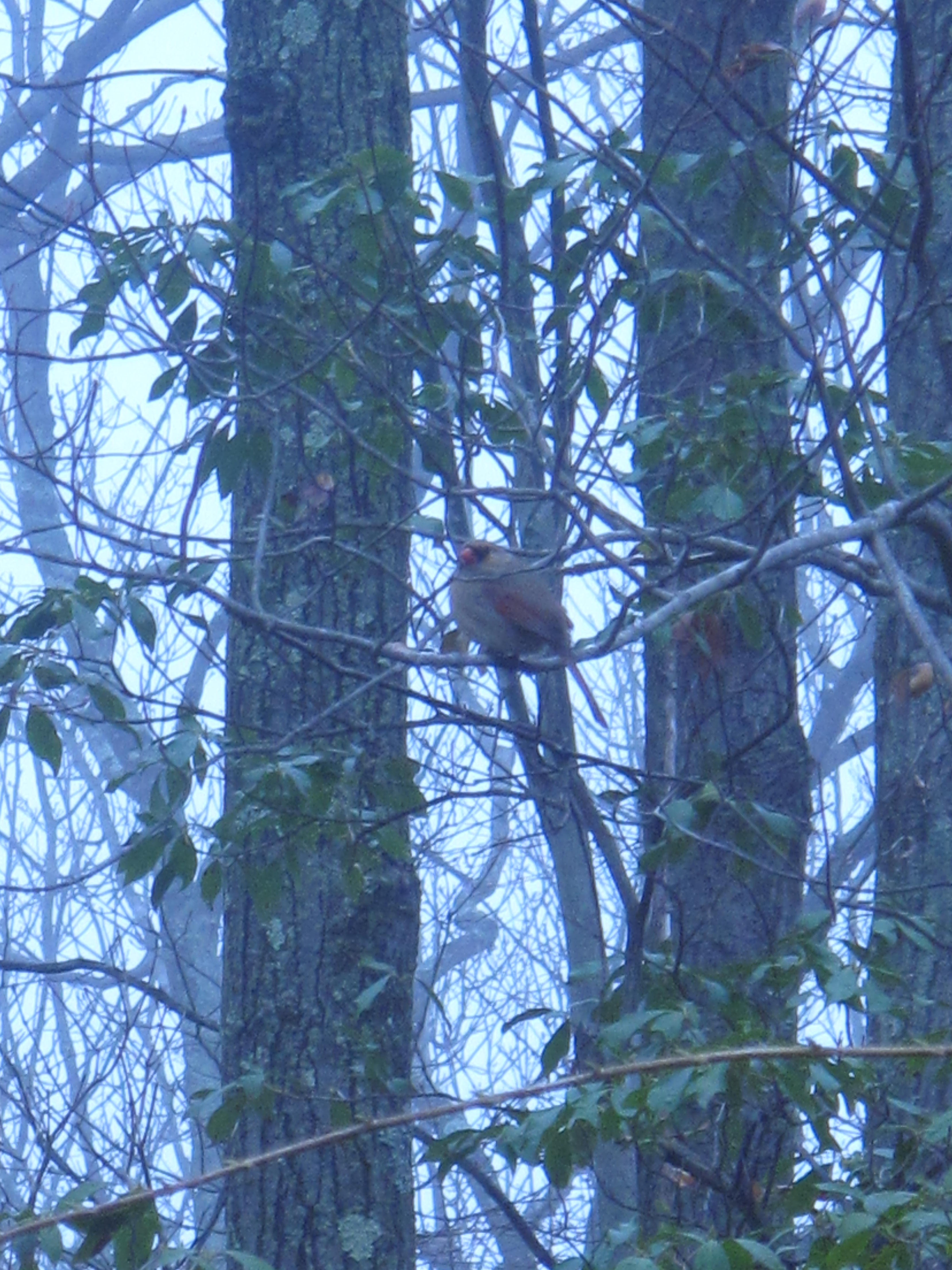 This is how we woke up this morning. Through closed windows and with light rain falling, we woke up to the sound of super loud bird noises. First, it was loud beautiful singing. Next, shrill one-note warbles. Then back to loud beautiful singing. Where we live, you never know what you are going to find when you pull back the curtains to take a peek. Today it was the sight of two male Cardinals fighting for the love of one female. I thought the fight looked pretty intense so I crept outside to take some pictures. I’m sure the Cardinals were also quite amazed at the sight of me running around in the rain in a t-shirt, pajama bottoms and no shoes trying to capture some pictures of their Spring love ritual. This ritual consisted of the female enjoying front row seats and sitting there watching the mayhem. All morning, one male would fly at the second male. There would be an in-air or on-branch fight consisting of a flurry of wings and loud warbles. Then one or the other male would fly off a few hundred feet away and rest and plot the next attack. First, meet the female. The object of their affection: