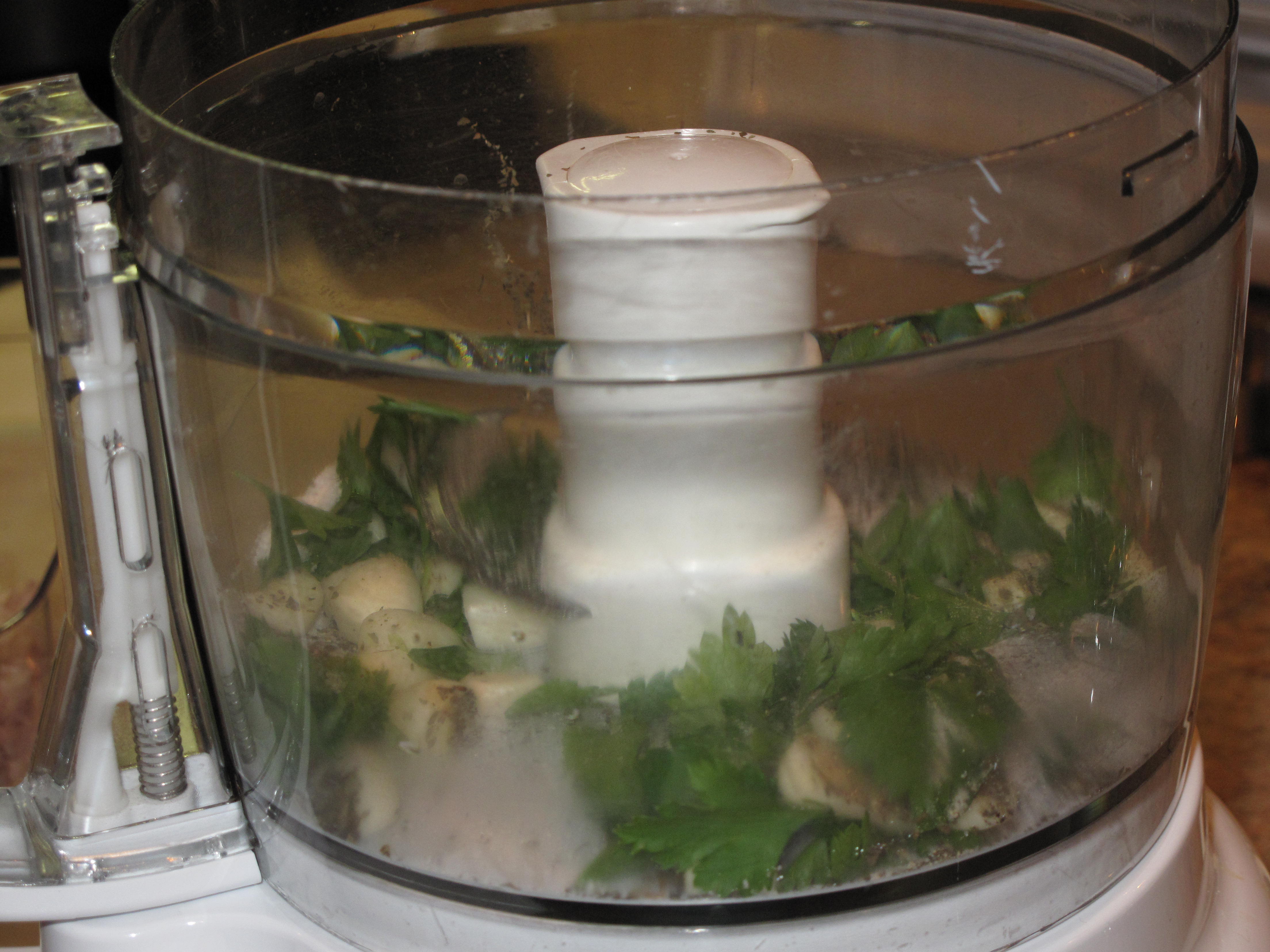 Place the garlic, parsley, basil, salt and pepper in the bowl of a food processor fitted with the steel blade and process until finely minced.