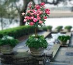 In early Summer, the tree rose begins to bloom and if you are diligent about removing the spent roses, the tree will continue blooming up until the end of the season. Tree roses are not actually a class of rose, but rather a way of growing them. A bush or climbing rose is simply grafted onto a straight trunk, giving the desired appearance. Here is the rose bush that is at the top of the tree we purchased.