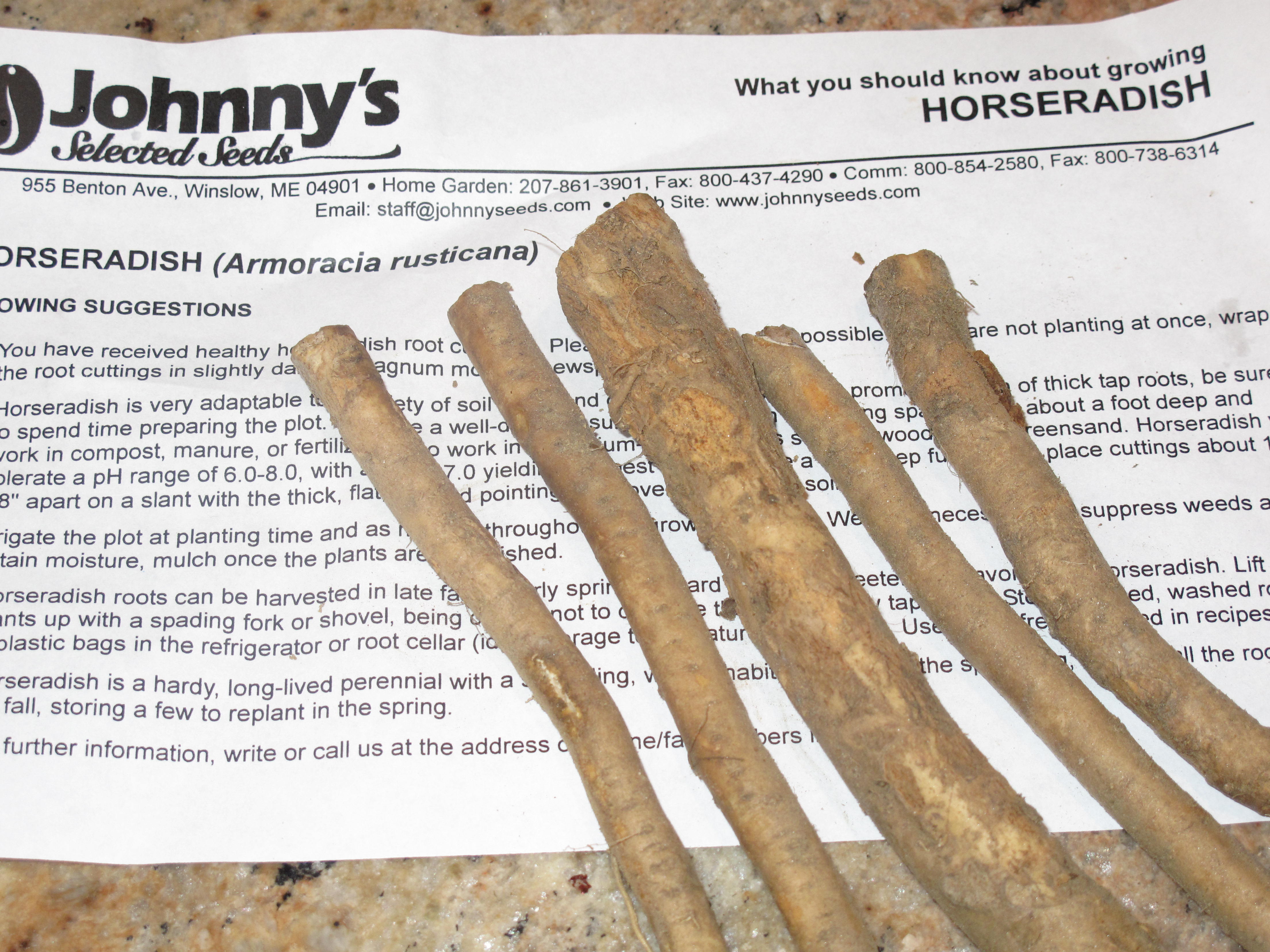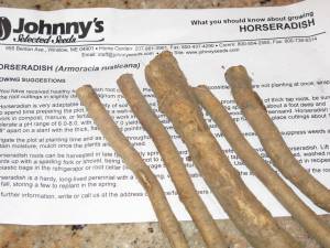 This is a love story about all things hot. Not hot like the sun, but hot to your taste. We love foods that have a little heat to them here on Glen Road. In fact, we are always taking recipes and putting a little heat into them. We add cherry peppers into broccoli rabe, we put cayenne pepper into almost anything and there is nothing better than cold clams with tabasco sauce, to name a few. However, our favorite is freshly roasted beef or a polish sausage with a little side of homemade horseradish. Funny thing is, we don’t have any horseradish that grows in our garden. When we want horseradish, we need to buy the root at our local organic produce market. Well, this is about to change because we have planted a bed of five horseradish roots. The five little brown stalks appear to be so innocent, but in a year they will produce thick roots that are filled with fire. These roots were planted down from our newly planted rhubarb patch, right behind the espalier apple trees. Let’s get the heat started with a little horseradish history from the internet: