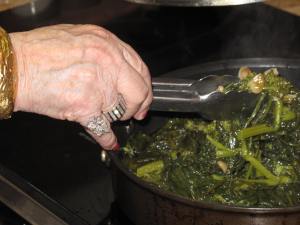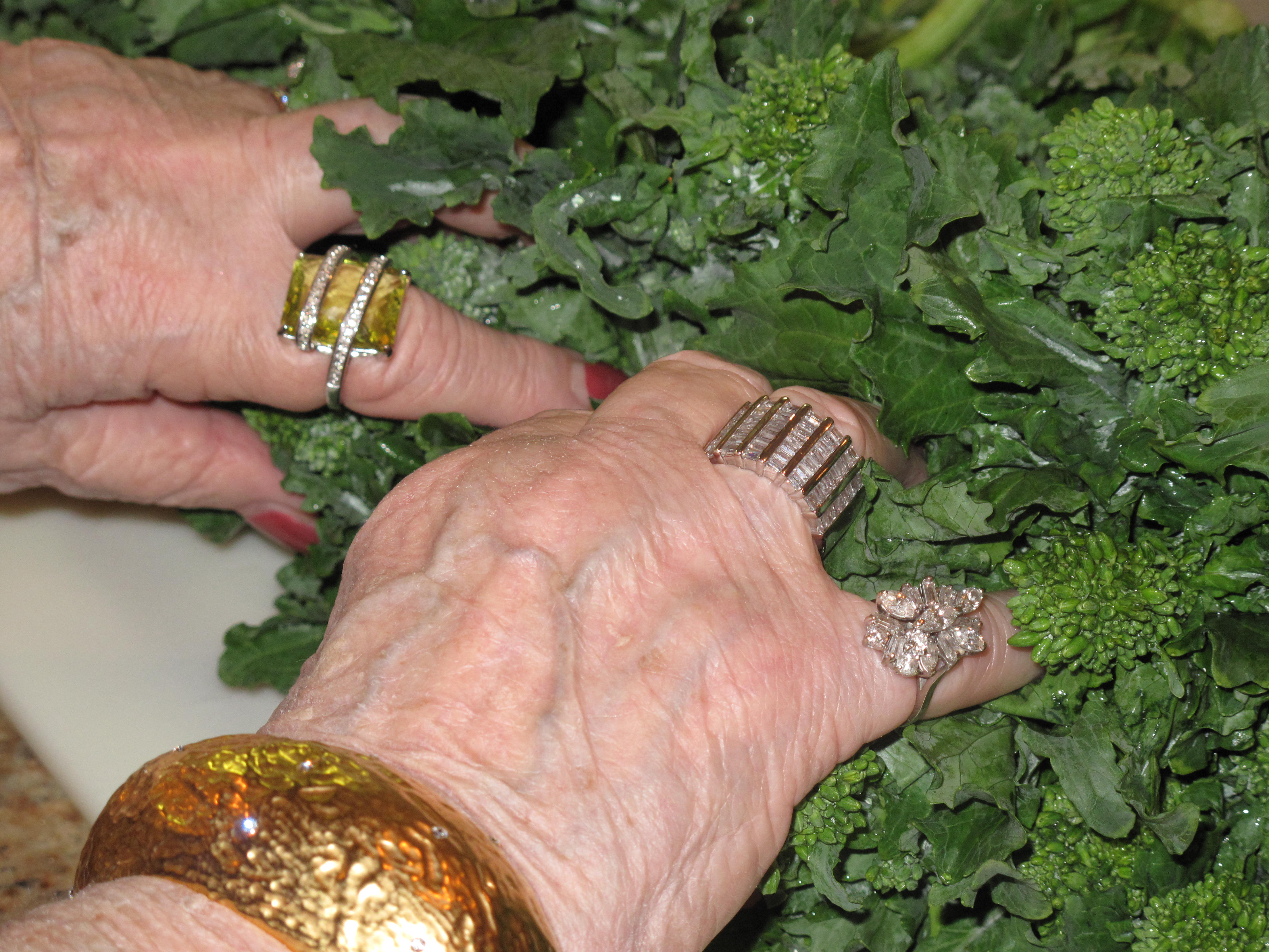 This is our Brooklyn Italian Grandmother back in the kitchen and digging into a pile of broccoli rabe. Otherwise known as cooking with your fingers only up to the base of your rings. We can dig that, can you? What has happened to the world of broccoli rabe these days? They steam it….good for you. Yuch, it is tasteless! They stir fry it. O.K., but limp and mushy. They saute it in water. That’s called boiling it where we come from. We asked our Brooklyn Italian Grandmother to come back into the kitchen and make it the good old-fashioned way so that we could share it with everyone. This is a great side dish and is quick and easy. When you are making an Italian dish, cook up some broccoli rabe and see what the family says. While many people say it has a bitter taste, we have found that if you cook it up the Brooklyn way, the rabe is soft and delicious. I’ve held the Brooklyn Italian Grandmother down and measured and forced her to tell me her recipe. So let’s take what I’ve forced out of her and cook up some broccoli rabe and go jewelry shopping all in one post.