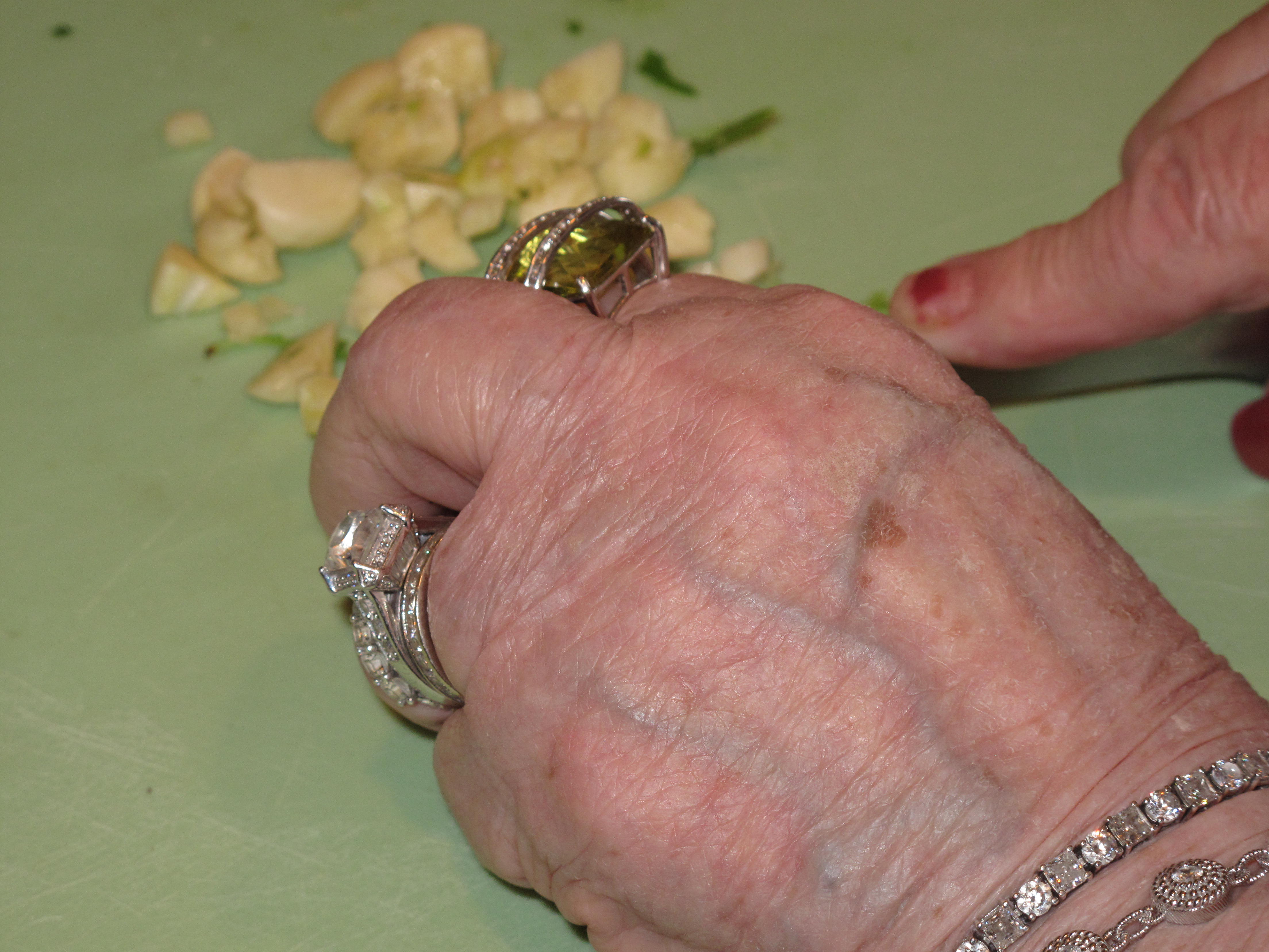 Rings always look better with a garlic scent to them. Multiple bracelets support the wrist during the chopping process.