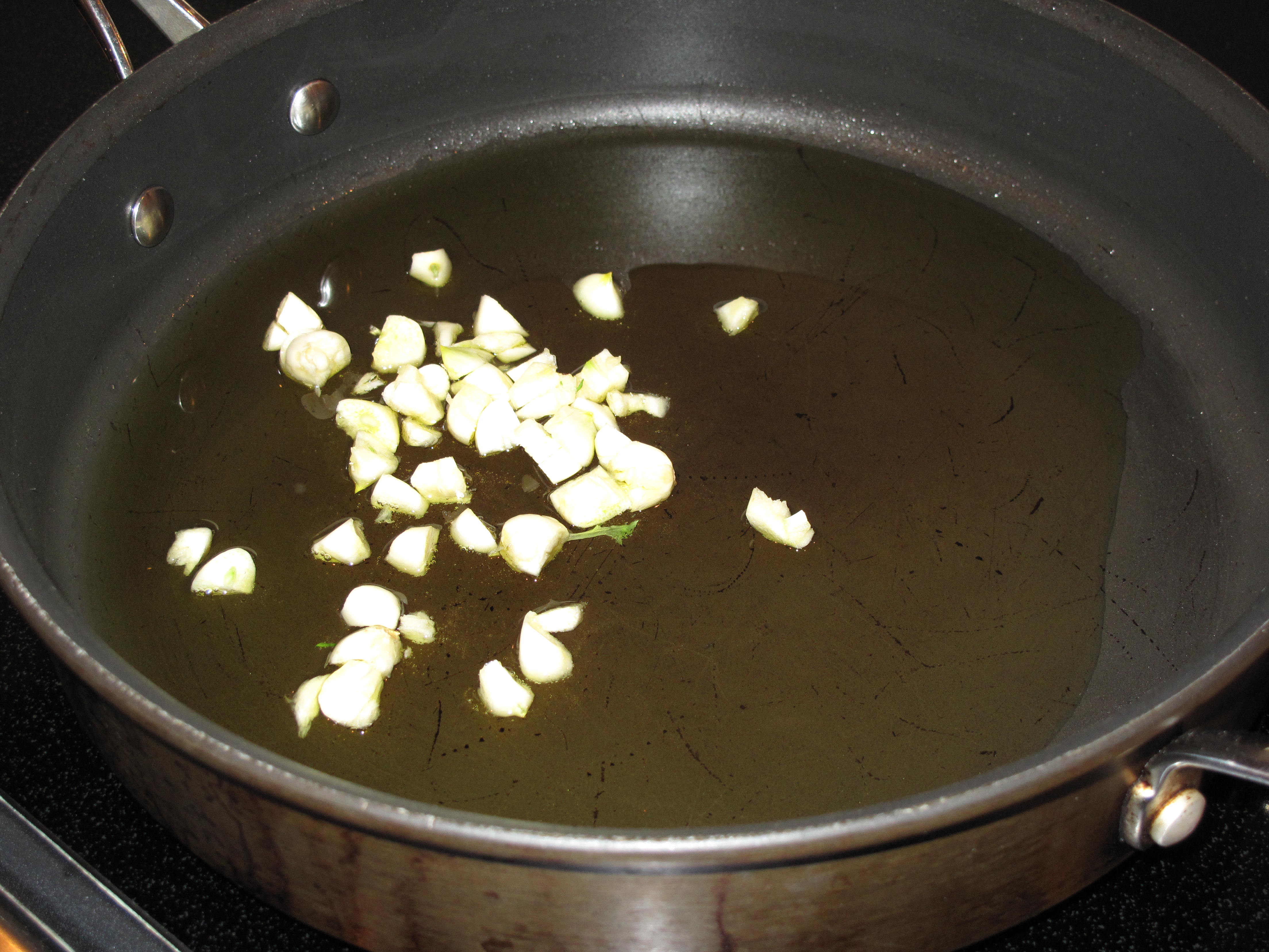 Over medium heat, heat the olive oil and then add the chopped garlic and sautee until garlic is lightly golden in color.