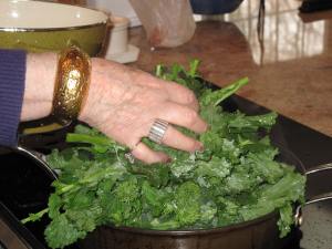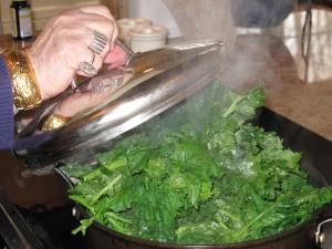 As the broccoli rabe wilts down during the cooking process, raise the lid and add a teaspoon of salt to flavor during cooking. Place the lid back on the rabes and saute for about 10 minutes. Lift lid and turn over the broccoli rabe so the bottom is now on the top and place the lid back on for another 10 minutes. Continue cooking until rabes are al dente, meaning tender but they still possess a little chewiness to them.