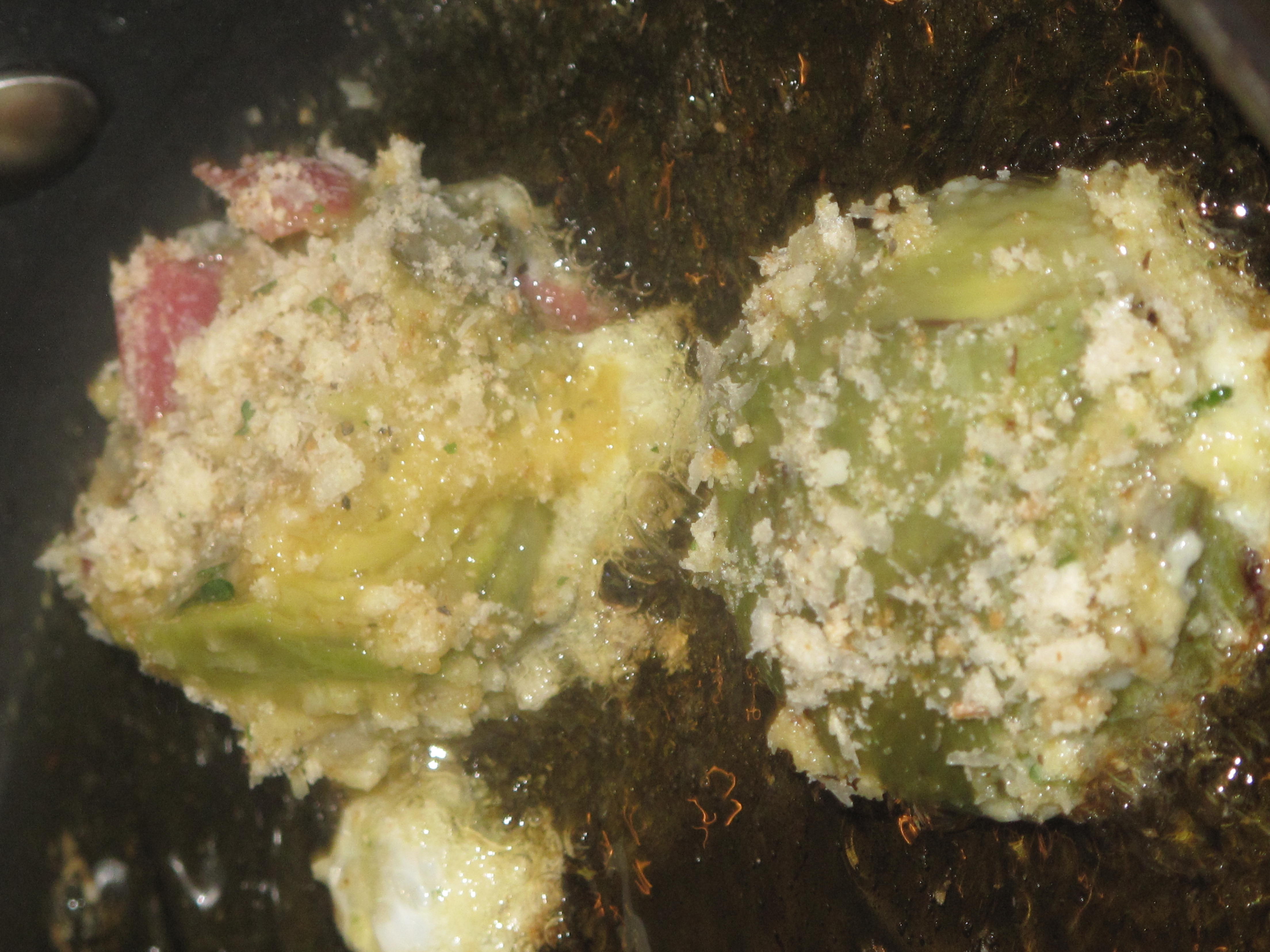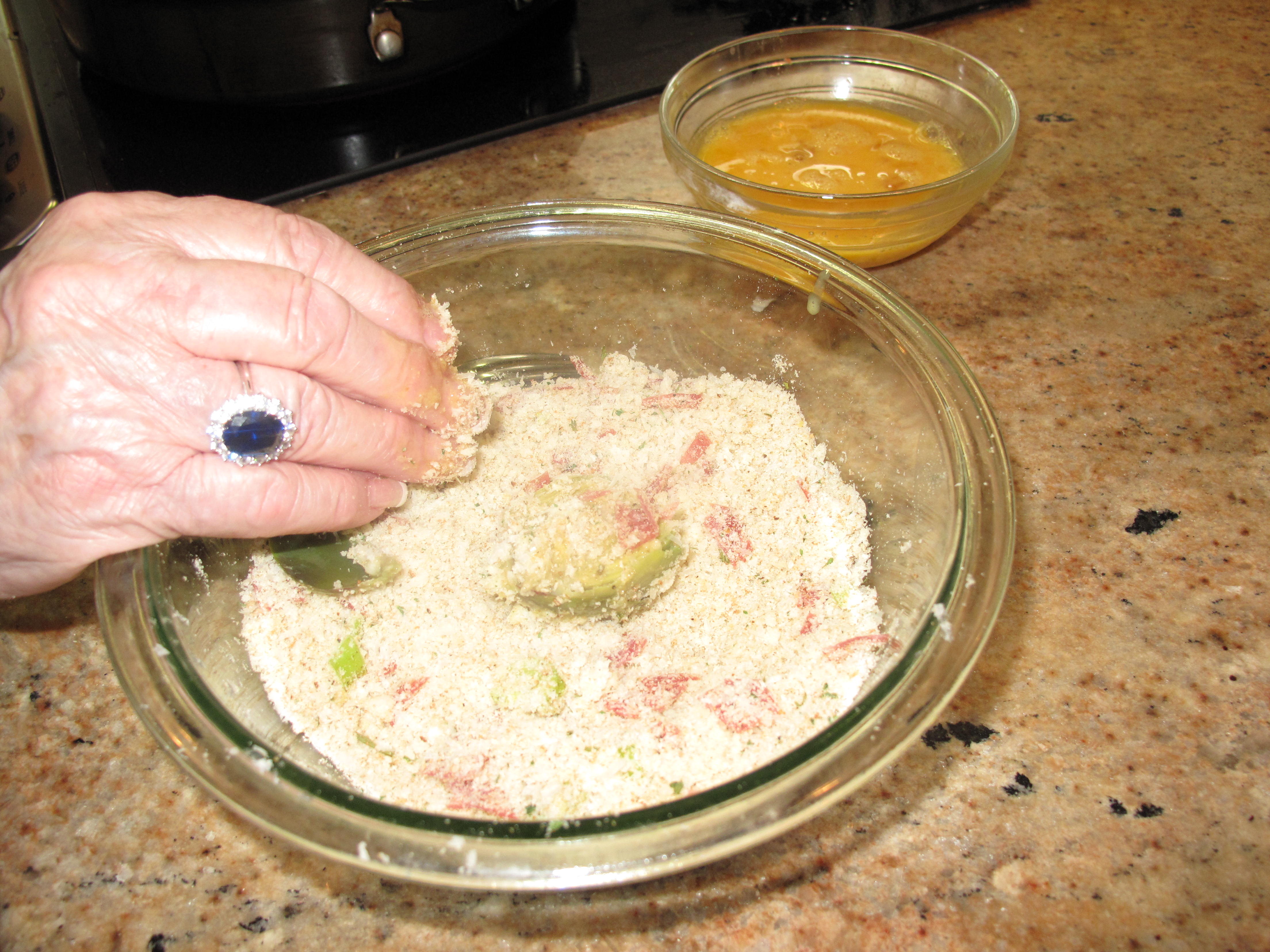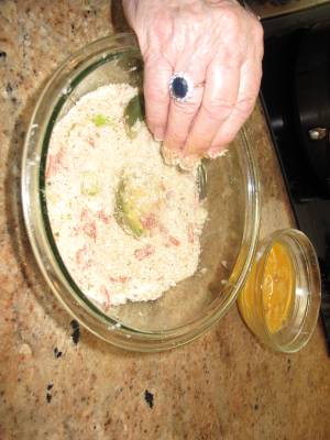 This is a pan full of baby artichokes. Did you know that they sell regular artichokes and baby artichokes? When the Brooklyn Italian Grandmother is in the house, she likes a dish that can start as an appetizer and then be carried to the table and continue as a side dish. That’s why she likes fried baby artichokes. The trick with this recipe is to get the smallest baby artichokes you can find. The smallest usually are about the size of a golf ball or a little bigger. If the baby artichokes are any larger than that, they will require a par boil to make them tender before frying. Our baby artichokes looked big so we actually par boiled them in water for about 20 minutes before starting the recipe. Once they had cooled, we took a very sharp knife and cut off the top and cut the stem off the bottom so that it could sit on its bottom without tipping over. After that, we cut them right down the middle into two pieces. For the breading, we used a mixture similar to what we made for the stuffing in our cubanelle stuffed pepper recipe. So sit back and let’s start frying some baby artichokes with the Brooklyn Italian Grandmother.