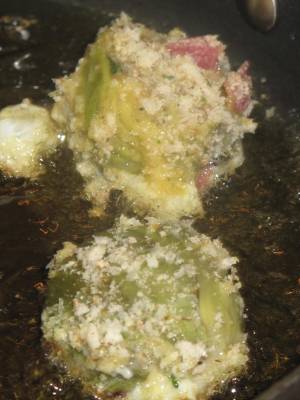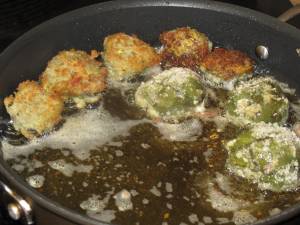 Place into heated olive oil and fry until breading is brown and artichoke is tender. Continue to add more olive oil as needed.