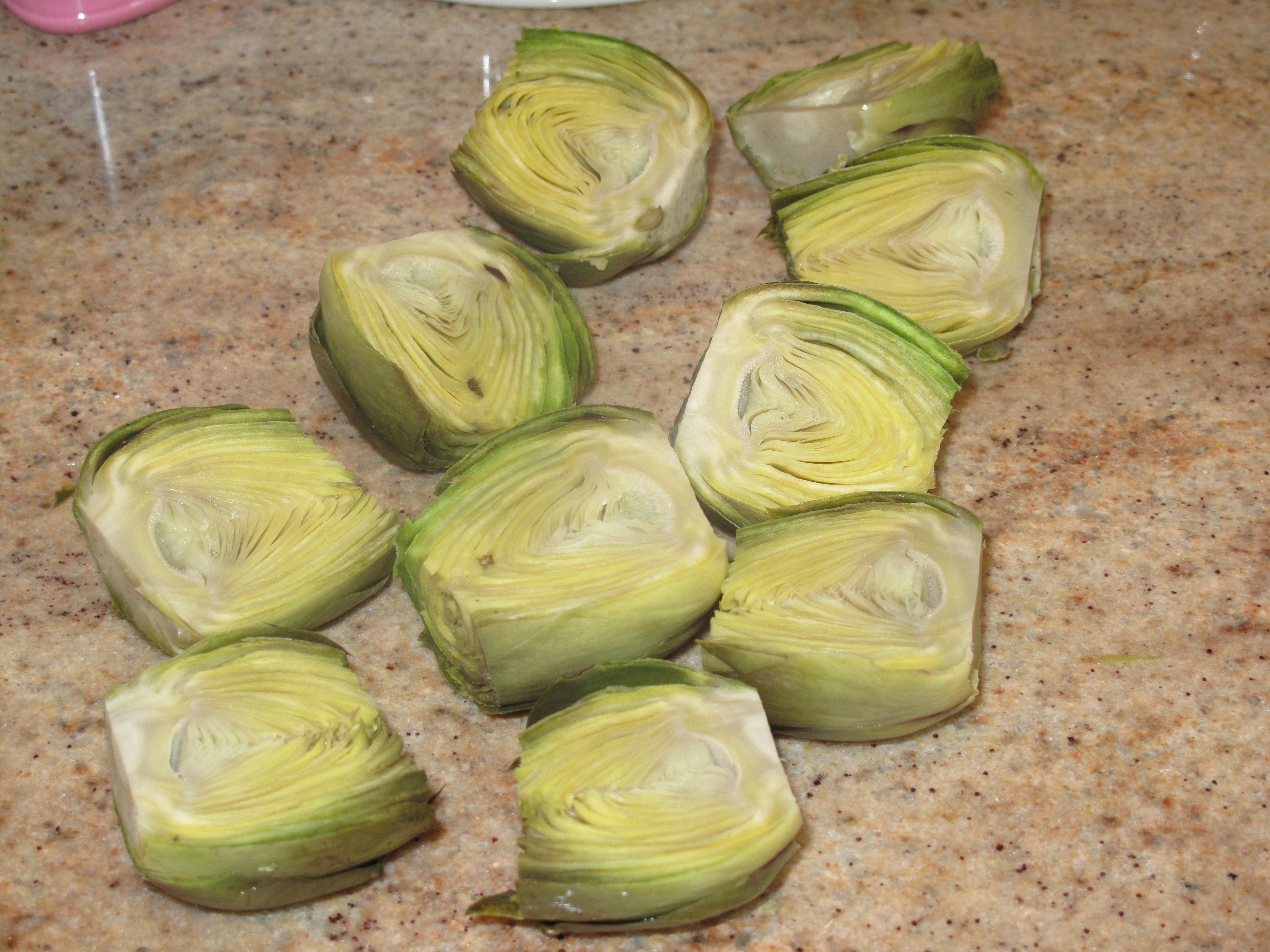 - 15 baby artichokes, cut in half (remember, smaller is better for this recipe)