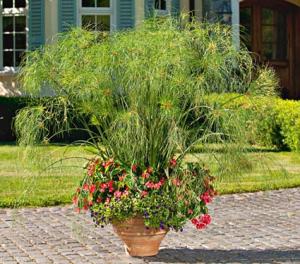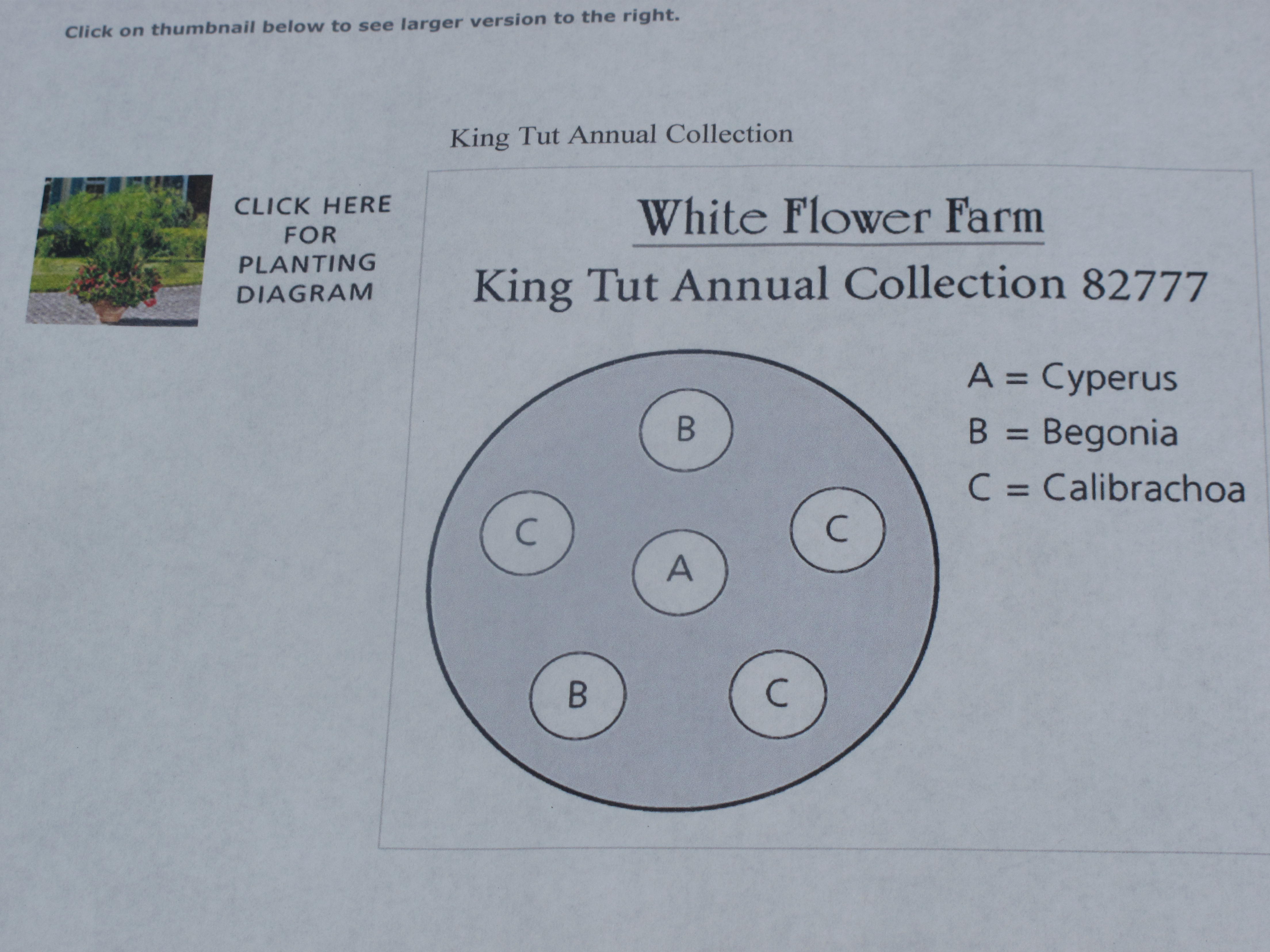 Our second selection was the ‘King Tut Annual Collection’. Ancient Egyptians used the leaves of Cyperus Papyrus to make paper, but here that sedge’s foliage creates a sensational display, rising 4-6 feet tall above the trailing blooms of Begonia Dragon Wing Pink and Calibrachoa Cabaret Deep Blue. Again, here is a copy of the detailed planting instructions, what the collection should look like at maturity and what the collection looked like after we finished our planting.