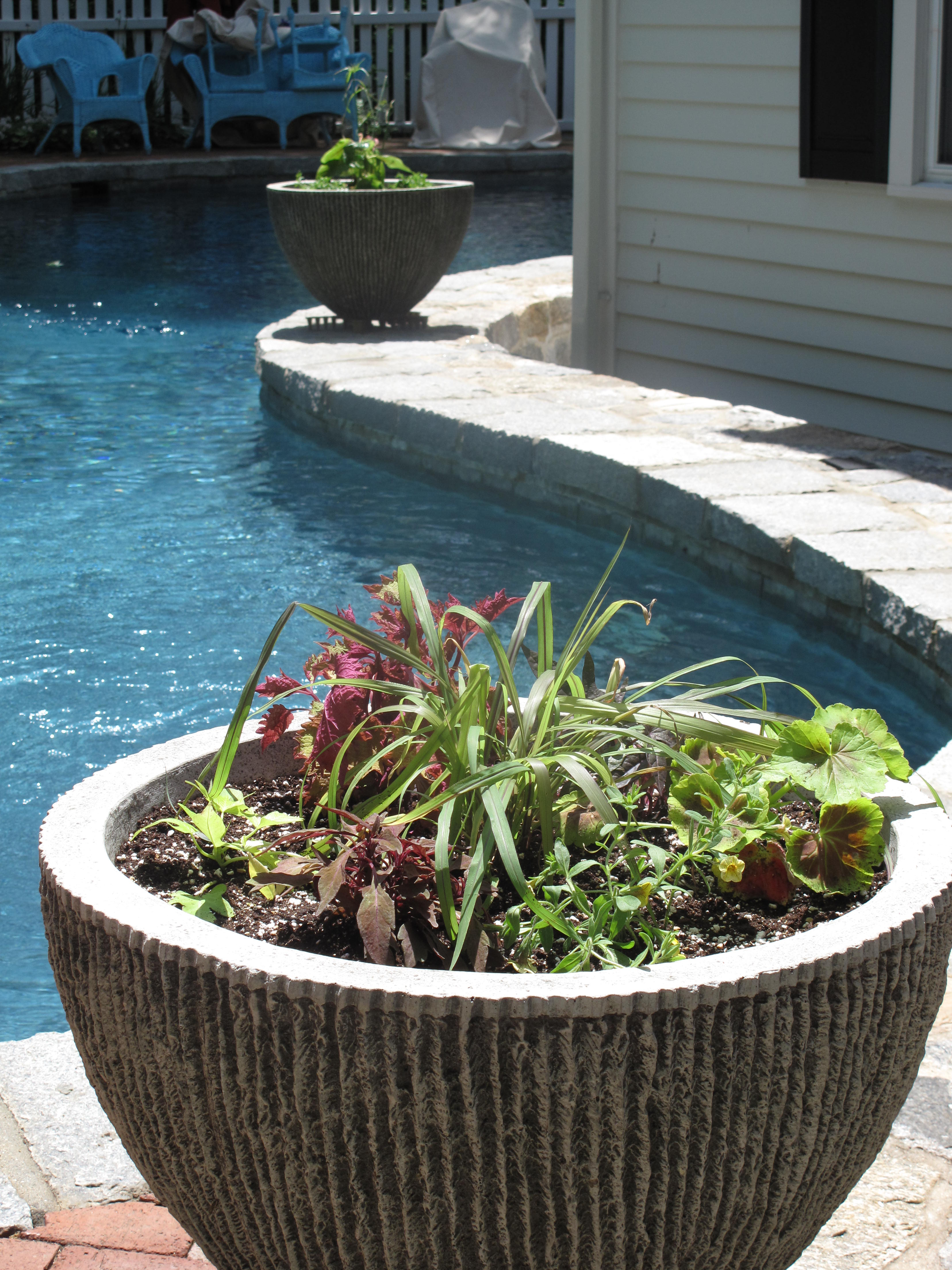 This is another legal pot here on Glen Road that needs to have plants placed inside of it. It is one of a set of planters that are new to our collection. I had to have this set because I am in love with faux bois finishes, which is French for “false wood”. A fitting name for items that appear plucked from the forest, but are actually made of cast stone, cast iron or cement. Faux bois items can also be painted to have the same woodsy look and feel. We were struggling to come up with the perfect mix of plants to put inside the pots, but once again, our friends at White Flower Farm, www.whiteflowerfarm.com, were there to help us with our decision. On their website, White Flower Farm has a large assortment of annual collections for sale. All you need to do is find the assortment of annual plants that you like and they will send them to you along with relevant planting instructions. Their instructions even tell you where to position each plant in the pot that you will be using. There is little room for a mistake when you purchase one of White Flower Farm’s annual collections. Since our faux bois pots are going along the swimming pool, we decided to select a collection that is a little more on the exotic side. Something that contained some large, tropical looking plants mixed along with more traditional plants like begonias or coleus.