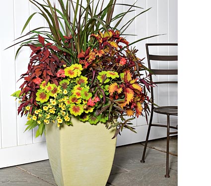 Our first selection is named the ‘Sunny Summer Annual Collection’. In this collection, the plants include an Ornamental Grass (Pennisetum purpureum ‘Princess’), a fancy-leaf Geranium (Pelargonium ‘Indian Dunes’), some unusually colored Coleus, Henna and Lancelot Velvet Mocha, a dark-leaved Ipomoea ‘Blackie ‘, a long-blooming Calibrachoa superbells saffron and a trailing Sweet Potato (Ipomoea sweet heart light green). Here is a copy of the detailed planting instructions, what the collection should look like at maturity and what the collection looked like after we finished our planting.