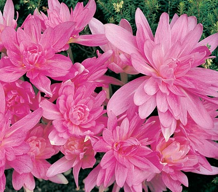 This is Colchicum ‘Water Lily’ and it is one of the last things to bloom for the season here on Glen Road.  It’s hard to imagine Fall without the appearance of our Colchicums.  Their bright blooms rise without warning and shine in the sharp light of Autumn.   We planted our bulbs at the base of our Japanese maple trees several years ago.  Colchicum ‘Water Lily’ produces several double, lilac-pink flowers.  Their silky texture is a great contrast to the ruddy complexion of Fall.