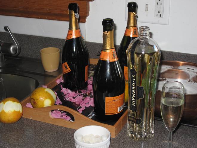 This is a sweet little drink we enjoyed this weekend at a party in Bucks County, Pennsylvania.  From the three open bottles of champagne, you can tell that it was pretty popular.  It is a drink that is on the sweet side.  What could be better….a sweet drink to enjoy on a sweet day.  My two friends that grew up in Iowa with me (they are sisters) from Peonies From Heaven had this drink and then made it at the party.  I don’t recall hearing the name of the drink.  I’m sure they didn’t invent it (although I’m sure they would claim that they did if you asked them), but I’ll go ahead and name it in their honor.  Because they have a wild streak and take every opportunity to harass me (I don’t deserve it) along with it being close to Halloween, I’ll name it ‘The Devil Sisters’ Champagne Brew’.  All kidding aside, this champagne brew is delicious.  Make sure to have the following ingredients on hand: