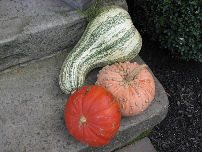 I’m always amazed at the colors that pumpkins and gourds come in at the patches we go to find and buy them.  There are the traditional orange pumpkins and green gourds, but there are also ones in ivory, yellow and variegated to name a few.  The odder the color, the more I like it!  Are you seeing pumpkins and gourds everywhere you look in your community?