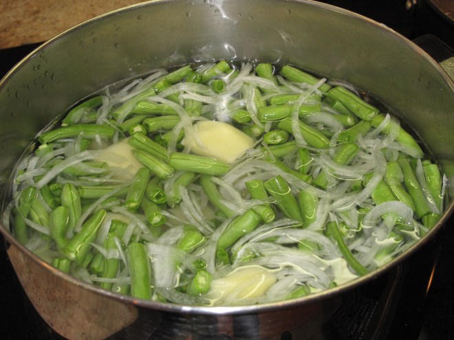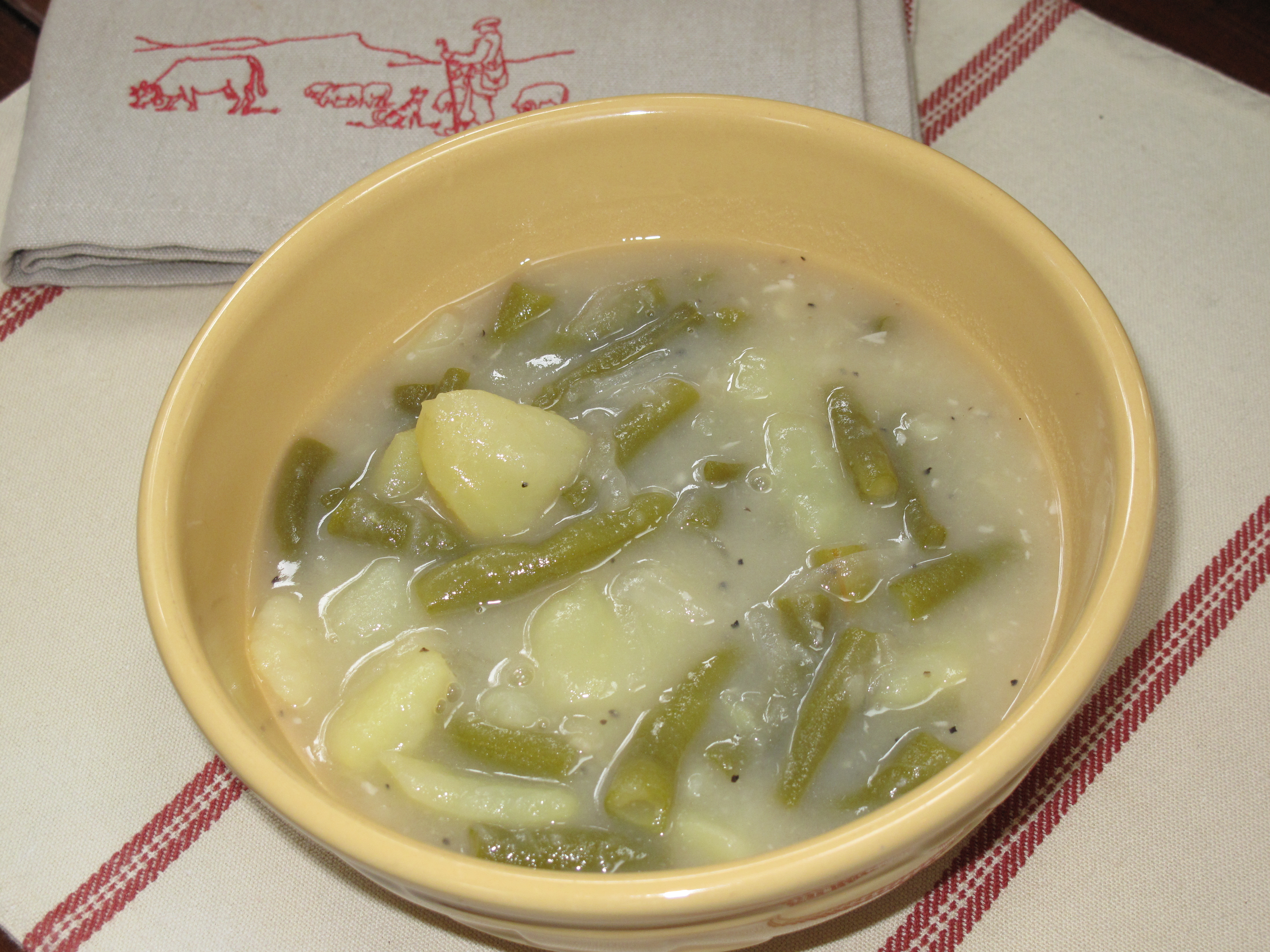 We’ve had a bumper crop of green beans here on Glen Road and I have been thinking about a green bean soup recipe that my Grandma used to make from as far back as I can remember. The problem was that I didn’t have the recipe and I would never be able to make the soup from memory. So I had my mom and aunt confer and get back to me on how to make this old-time soup just like my Grandma used to make it. There are a number of foods that I remember from when I was young and this soup was one of them. I know to many that the idea of a green bean soup will not sound too appetizing. However, when you add thinly sliced onions, cubed potatoes and a garlic-laced roux, you end up with a slightly thick green bean stew with lots of flavor. My recipe is for a double batch. Some to eat now and some to freeze for later this Fall when soups just seem to taste better. So if you have a late season green bean harvest and don’t know what to do with them, why not give my Grandma’s green bean soup a try. It starts with some fresh green beans: