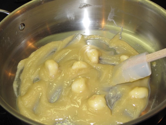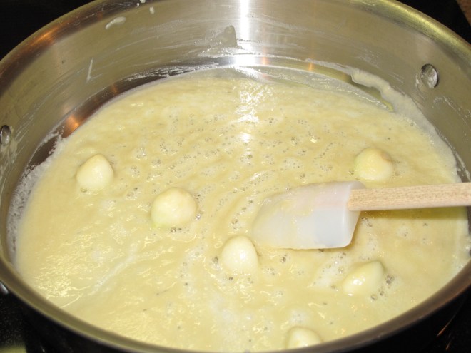 The beginning–the flour and cooled, melted butter combined and then the garlic cloves added before turning up the heat: