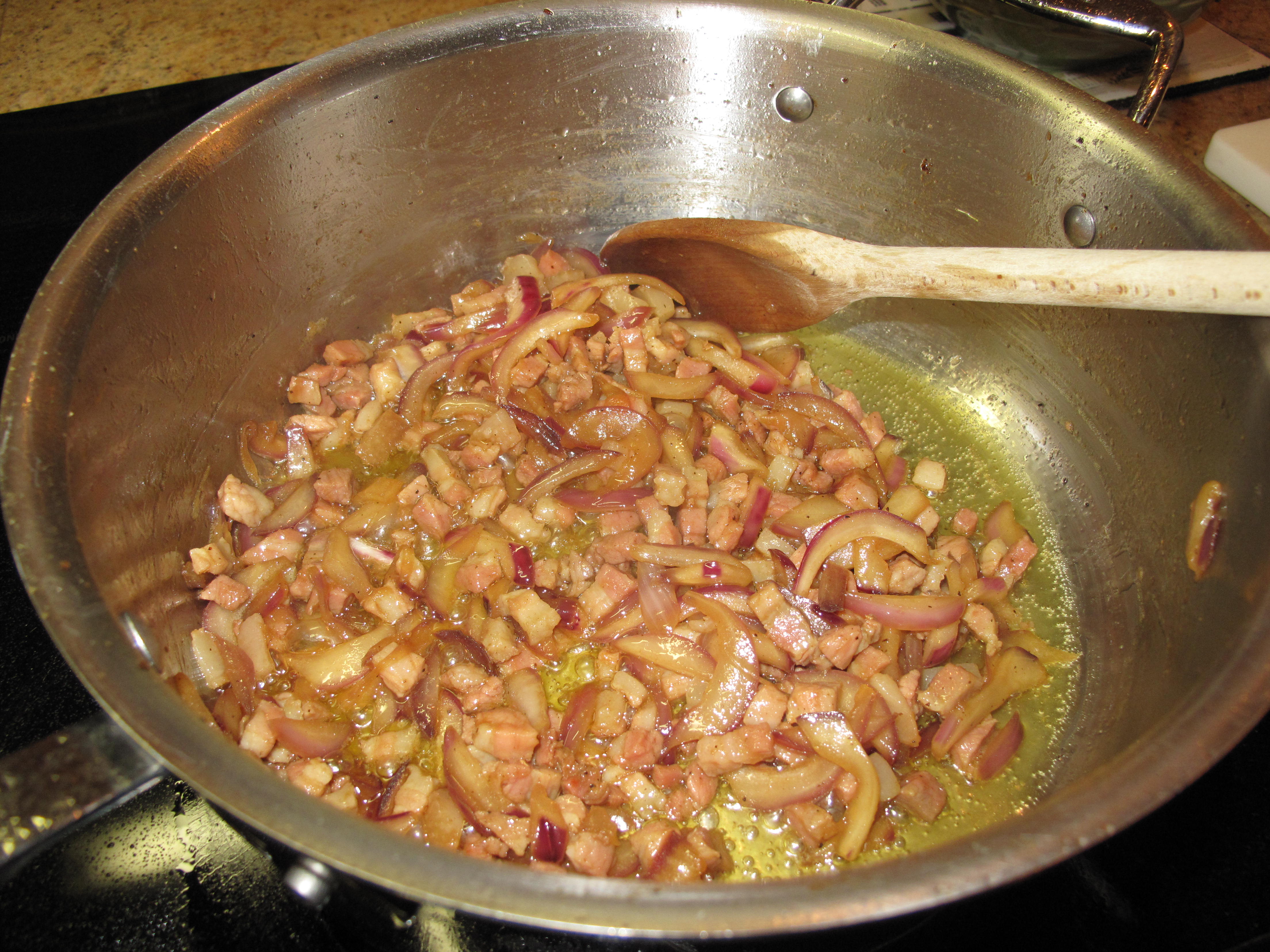 • 6 cups lettuce (the lettuce is going to wilt a little because you will put a hot dressing/skillet gravy on top of it…..get some greens that can take that..romaine, red leaf, frisee mixed together work well)