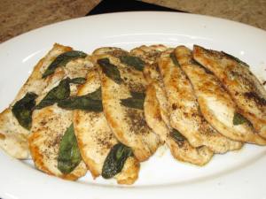 Steam string beans until al dente, 3 to 4 minutes.  Dump them into a bowl and set aside.  Slice chicken breast halves in half horizontally; pound lightly, to an even thickness to make 8 paillards.  Season paillards with salt and pepper.  Top each with 2 sage leaves.  Saute in a skillet with olive oil over high heat for 3 minutes.  Flip, and top each with more salt, pepper and 2 more sage leaves.   Heat until cooked through, about 3 minutes more.