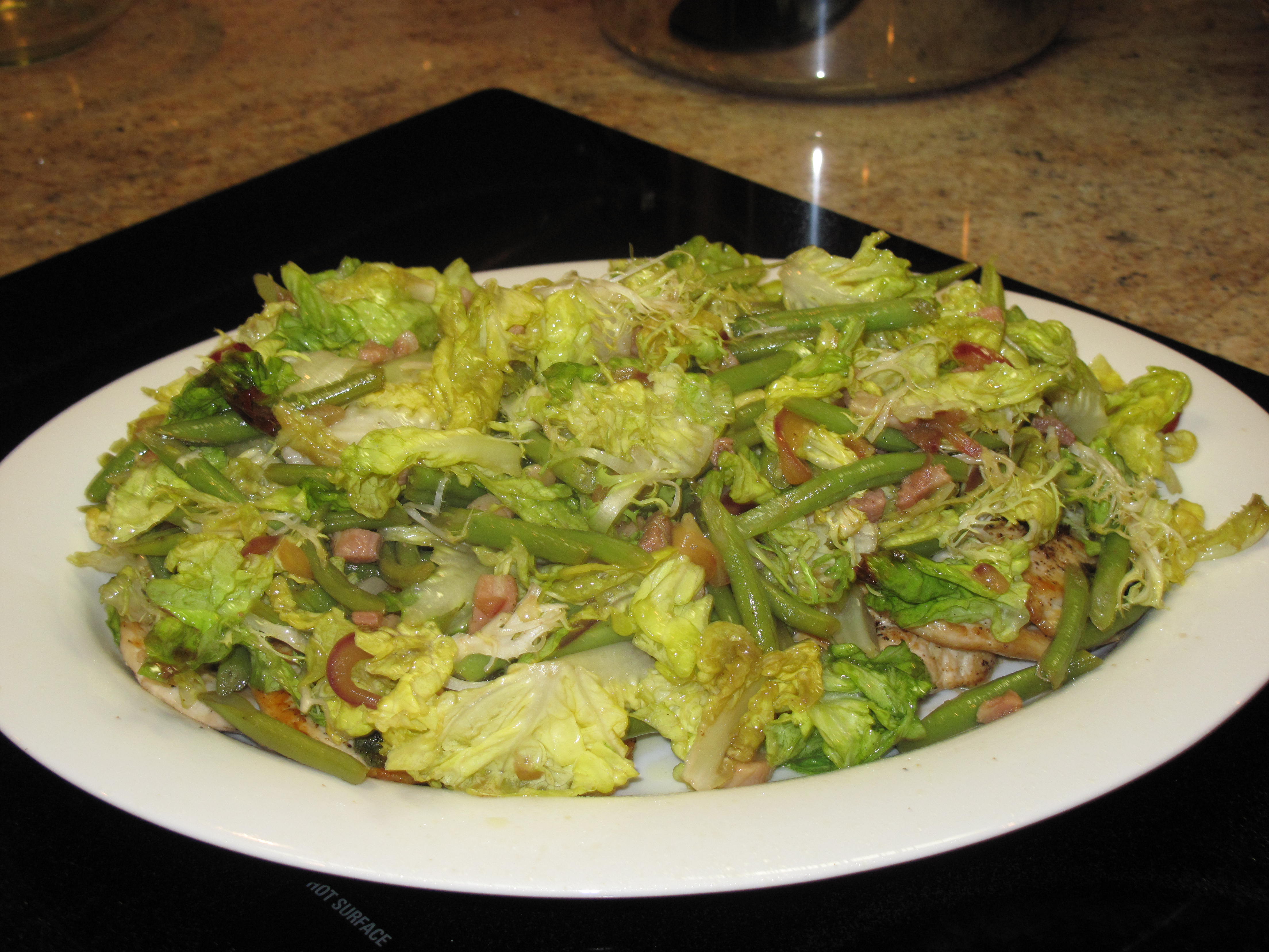 Add red-wine vinegar; stir in green beans.  Simmer for about two minutes to let the vinegar cook down a little and to heat up the green beans.  Toss with lettuce.  Serve over paillards.  There is a lot of greens and beans as you can see.  You can barely see the chicken under all of this salad.