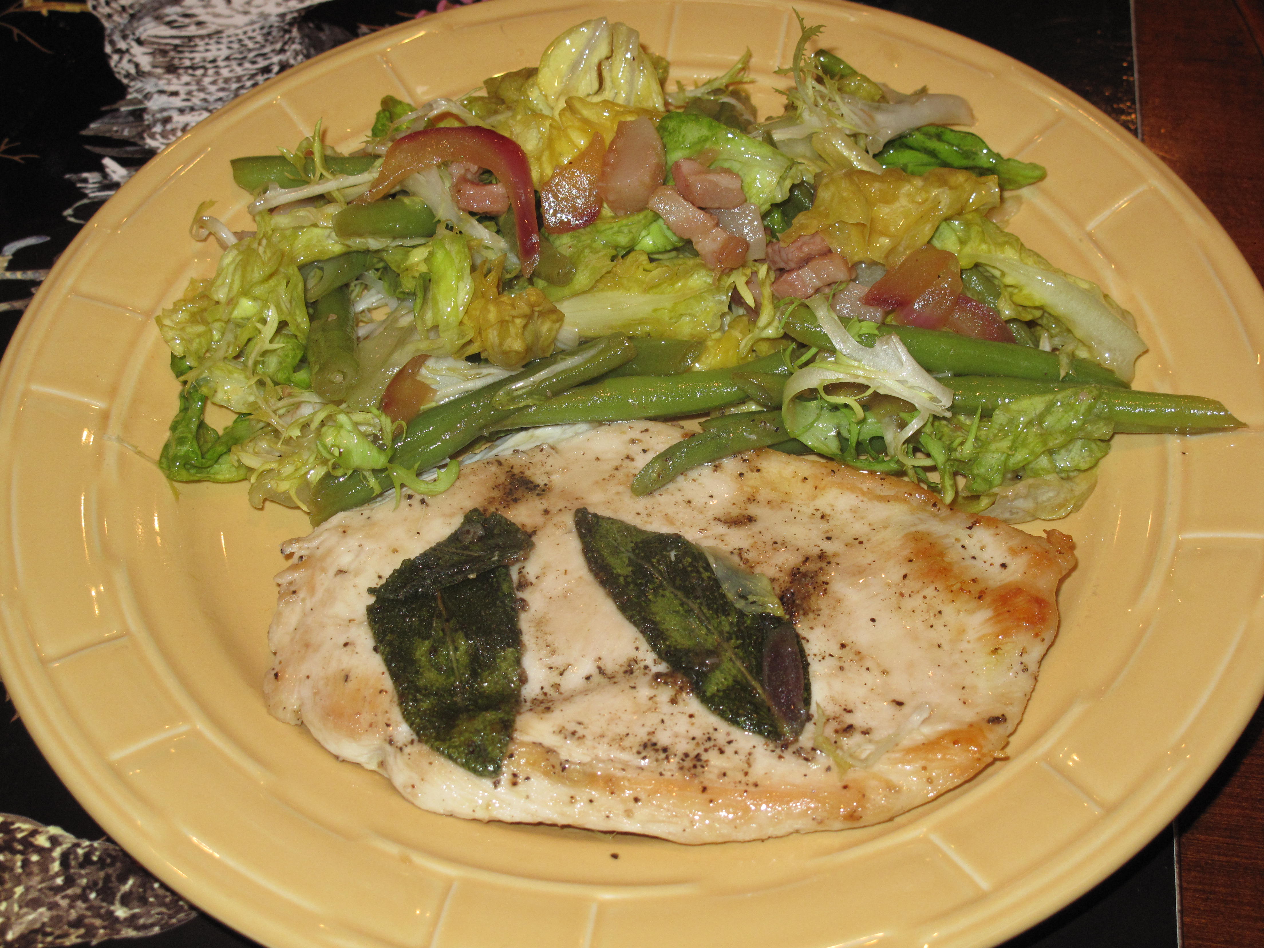 Simple and quick.  We were not in the mood for crazy and difficult. Very tasty and hit the spot.  The warm dressing on the slightly wilted lettuces was a nice touch.  The pancetta, onion and vinegar had a nice mix of flavor.  Believe it or not, the chicken also kept its sage taste which surprised me given that I thought the flavor would be in the olive oil and not the chicken.