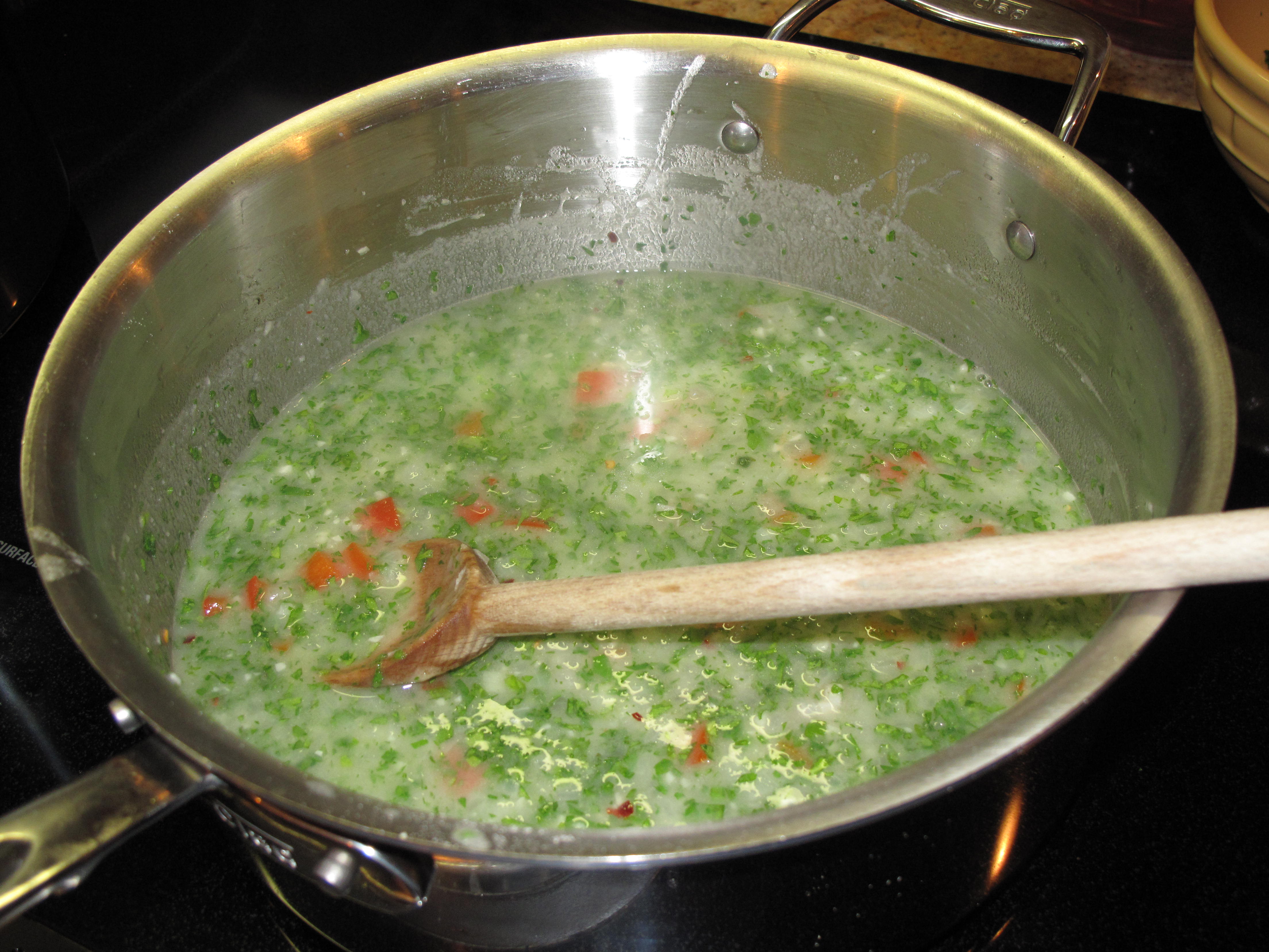 Slowly, in a steady stream, pour the egg mixture into the boiling broth.  Stir slightly.  Reduce the heat to medium and let cook for 1 minute.  Drop the spinach into the broth to wilt.