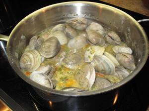 Add the sausage and the clams.  Cover and bring to a boil.  Simmer just until the clams open.  This will take no more than 5 to 10 minutes.
