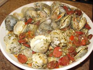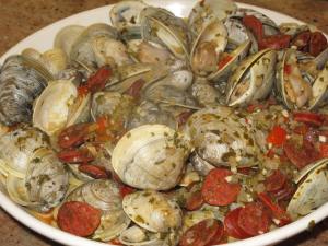 I love the idea of mixing clams with sausage.  This recipe is somewhere between a paella and a pasta dish with seafood.  The sauce starts out very pale and reddens up after the addition of the chorizo sausage.  The sausage also adds a little heat to the recipe which is another thing I like.  Don’t get me wrong…this is not over-the-top hot, but just enough kick to make it interesting.  The parsley is also a nice addition.  I always use Italian flat-leaf parsley because I think it is less bitter than the curly variety.  The recipe below is modified from the original.  I use less clams, onions, red pepper and parsley than the original.  I just think the original will make too much food.  For example, the original says to use 6 dozen littleneck clams…that seems like a lot to me.  Try making this recipe….it’s like a delicious beach clambake in your own dining room.