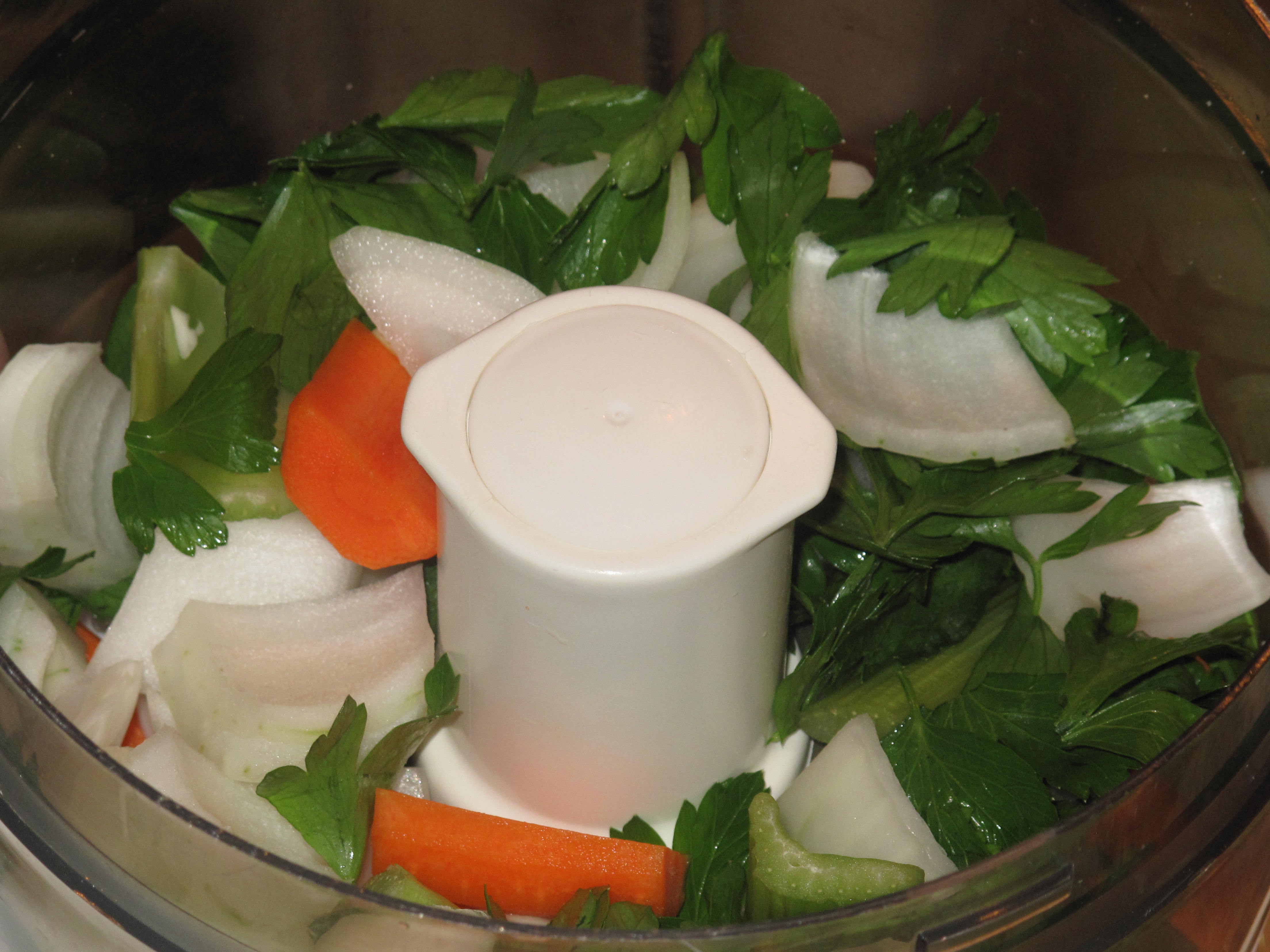 Pulse the large chunks of garlic, onion, celery, carrot, and parsley in food processor until finely chopped.  Remember to let the food processor do all the hard chopping work.  This is a huge time saver.