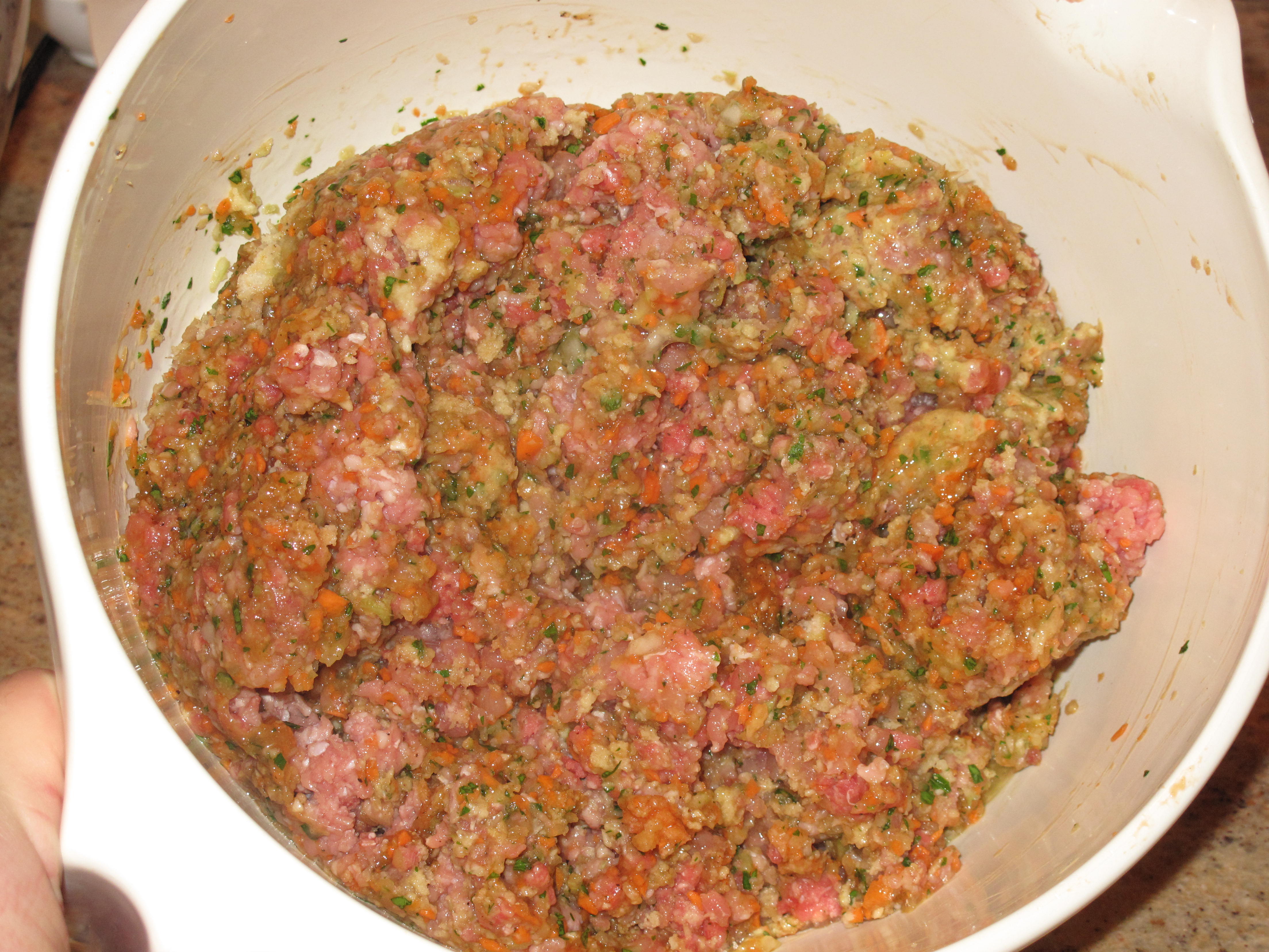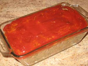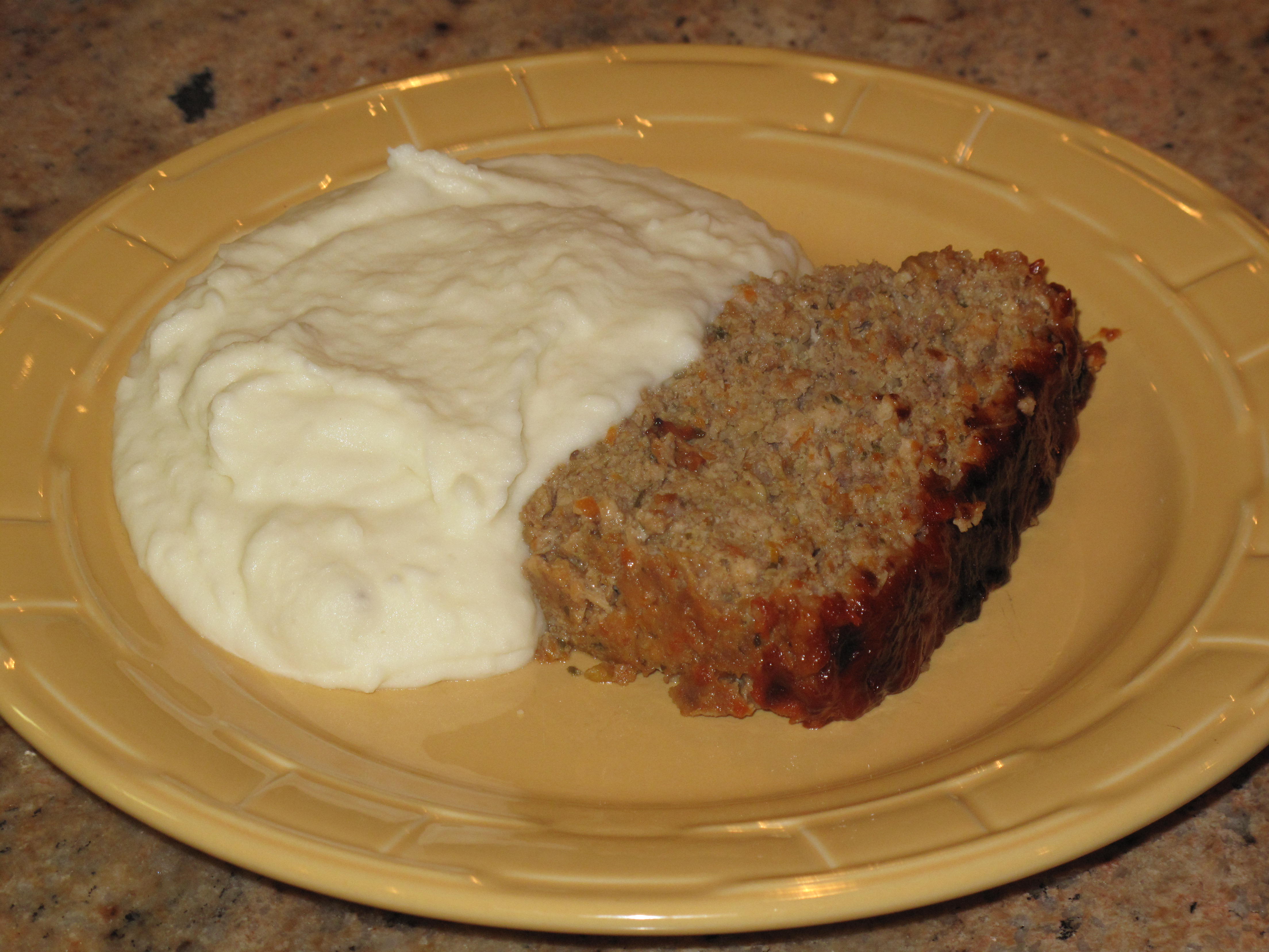 This is some real comfort food if there ever was some.  It’s good old fashioned meatloaf with some creamy mashed potatoes.  But it’s not your ordinary diner-style meatloaf.  It’s not dense and dry and covered in brown gravy.  No, this meatloaf recipe is a twist on that old recipe and produces a light and juicy meatloaf topped with a sweet and sour glaze made from ketchup and brown sugar.  It also is pretty quick to prepare because all of your vegetables just need to be chopped in large chunks and then ground in the food processor.  You don’t need to stand for hours dicing celery, carrots and onions.  It also incorporates three kinds of ground meat to make the meatloaf light and full of flavor.  I also use Pepperidge Farms as my white bread of choice when I make this recipe.  Why only Pepperidge Farms?  When I was younger and used to go to the grocery store with my parents or my Grandma, I used to beg to buy a loaf of Pepperidge Farms bread.  I figured since it was so much more expensive than the other loaves than it had to be like a slice of heaven when you ate it.  I would explain to them the facts of how it was made with care by jolly looking bakers who kneaded the dough with their own hands with tender loving care.  I would tell them about the ovens where the bread was baked and how it was wrapped in paper and then placed in the plastic bag for extra freshness.  Not only that, but they wrapped it while it was still warm from the oven.  This is why too much television is bad for a small child to take part in every day!  My parents or my Grandma would stare at me in disbelief that here was this small child reciting facts he had learned from a bread commercial.  It must have been this scary little feeling inside of them that always made them tell me no.  My parents and Grandmother were tough because I remember begging (and many times probably crying and screaming) to buy a loaf of this special bread.  Why don’t they see what I see in this delicious loaf that is so much better than the other white breads out here on this rack?  Now that I have my own money, I always buy Pepperidge Farms white bread to use at home.  I’ve come to realize that it doesn’t necessarily taste any better, but it’s just the whole principle of the matter, if you get my drift.  Bread aside, if you are looking for a comfort food classic with a twist, give our meatloaf a try.  Your family will love it.