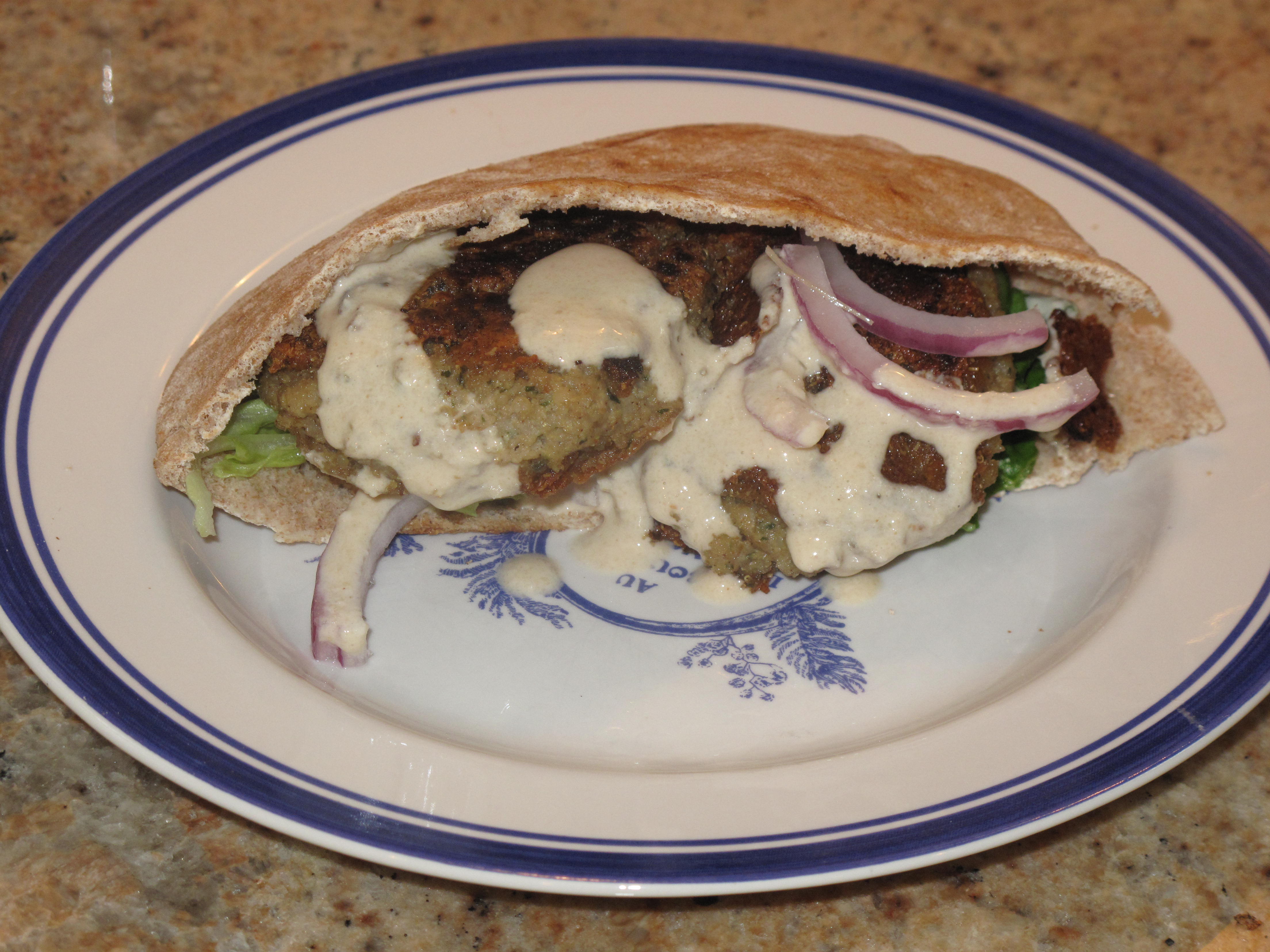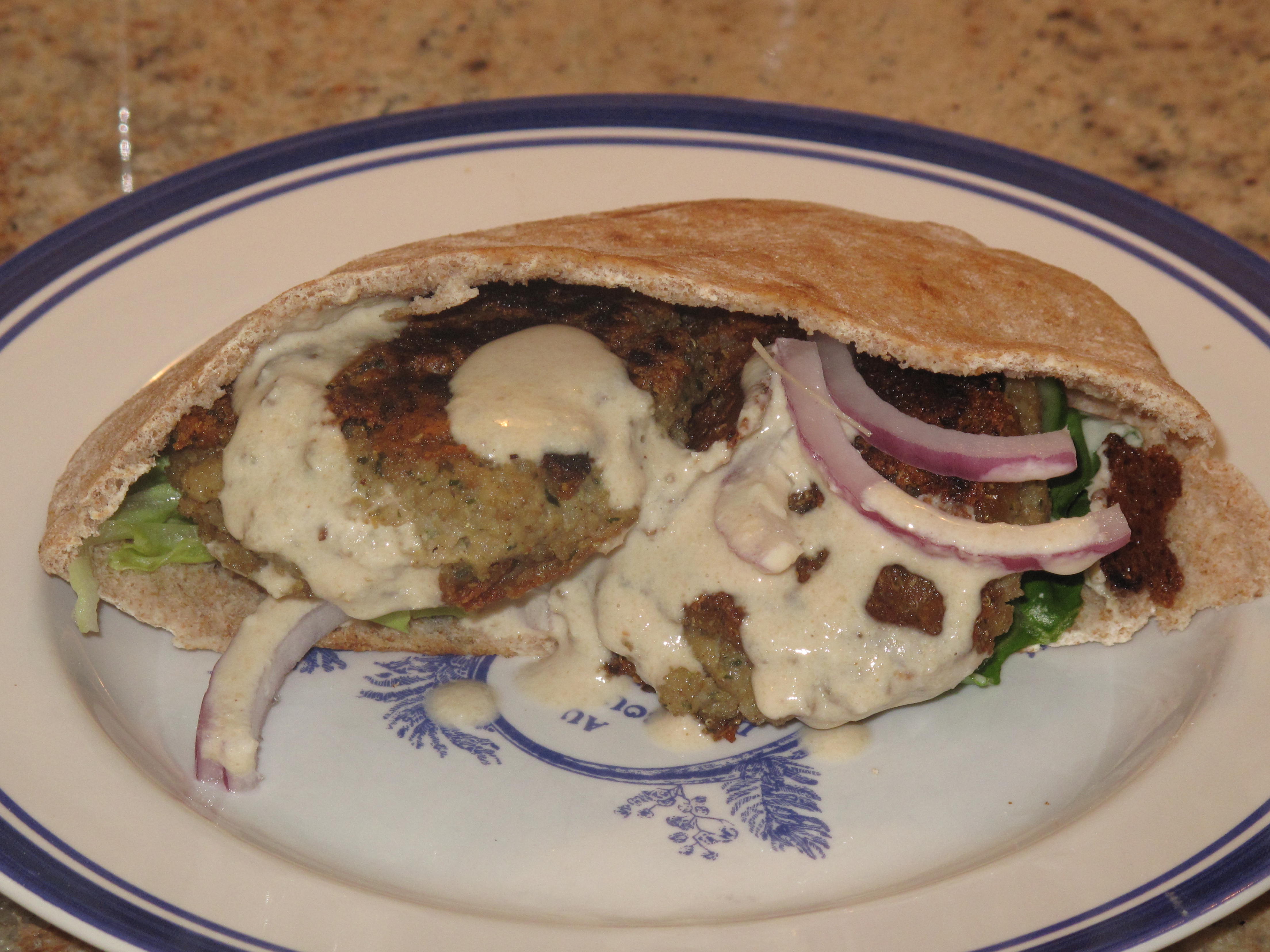 This is proof that eating healthy and dieting doesn’t have to taste bad. As we have said, all of us here on Glen Road are trying to shed a few pounds. Being on a diet is hard enough, but being on a diet on the weekend (especially in a house that loves to cook and eat) is crazy difficult. So we decided to plan out a few meals that we would cook and eat over the weekend to make sure we were still in the kitchen, but eating foods that are healthy and good for us. This is a recipe for a healthy sandwich we put into whole-wheat pita pockets. We modified it from a recipe that is in a cookbook titled ‘Power Foods’ which is from the editors of ‘Whole Living Magazine’. These patties are inspired by the Middle Eastern dish kibbe, most often made with ground lamb and bulgur wheat. This pita is stuffed with great vegetables, patties made up of a mixture of turkey and a grain called quinoa and finally topped with a drizzle of an easy tahini dressing. The combination of turkey and quinoa is very rich in protein, with a chewy texture that contrasts nicely with the crisp vegetables and the creamy tahini dressing drizzled on top. Tahini is a very thick ground sesame seed paste. The paste is turned into a dressing by adding lemon juice and garlic. Let’s dig in!