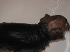If you guessed number six, you would be correct. So this weekend, it was off to the tub for me. Never a pretty picture. So you can understand what it takes to make me so glamorous, I have authorized the release of these bath pics to the general public. Here I am after my initial spray….I am trying to flee by running up the side of the tub and out of the room.